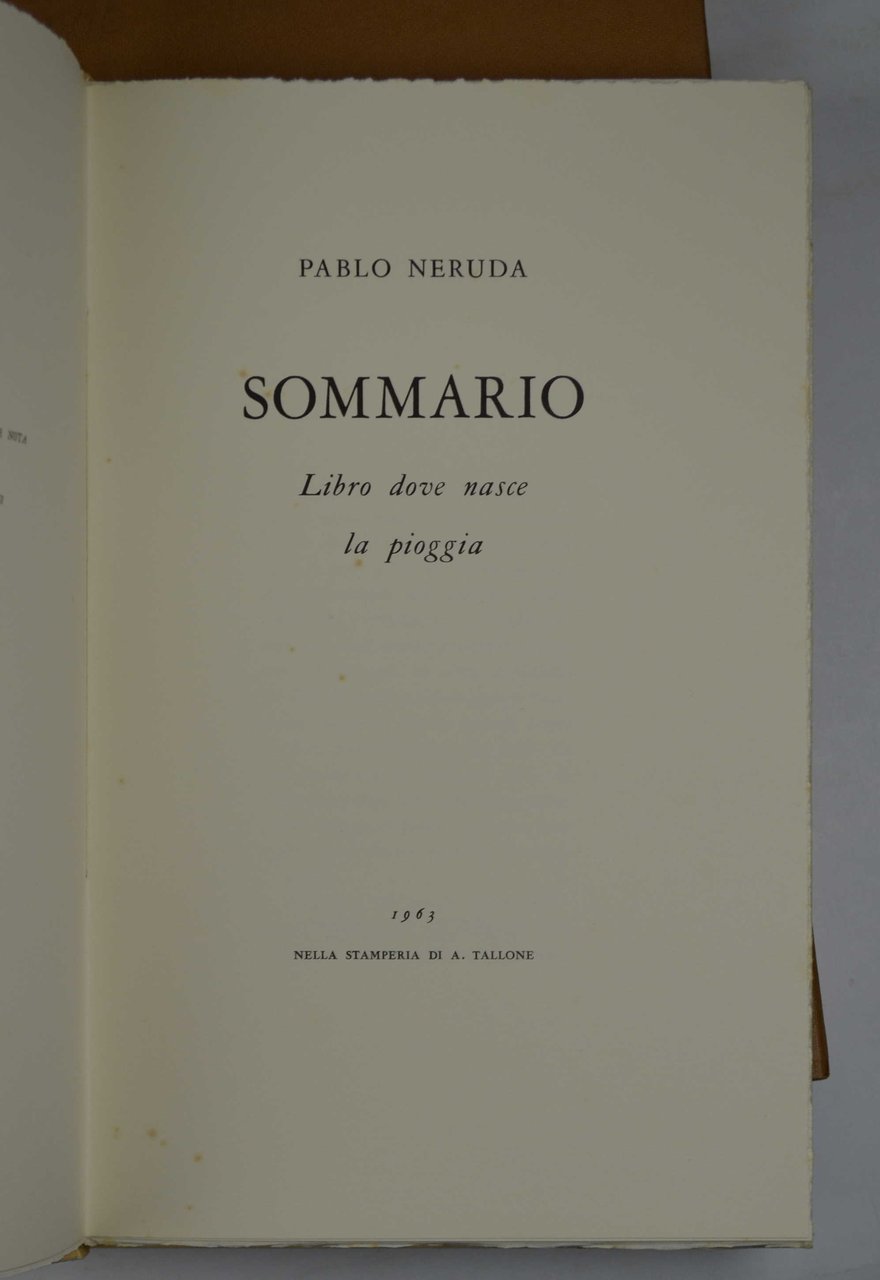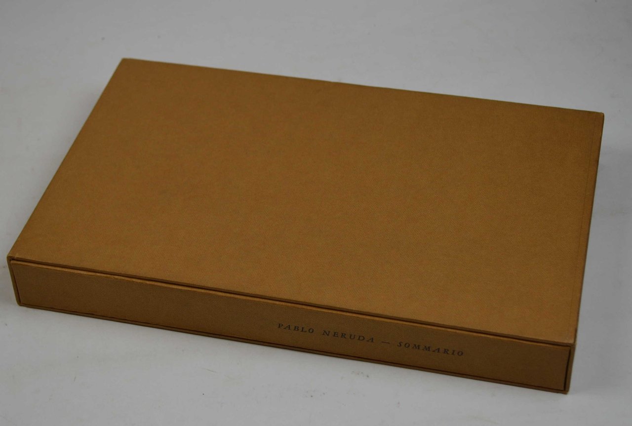 Cm. 29, pp. 112 (8). Bross. orig. entro camicia e custodia. Perfetto stato di conservazione. Edizione a tiratura limitata di soli 300 esemplari stampati su carta distinta. Edizione originale, rara della prima edizione di 20 poesie inedite di Neruda che l'autore volle espressamente che fossero stampata da Tallone. Cfr. Pellizzari.