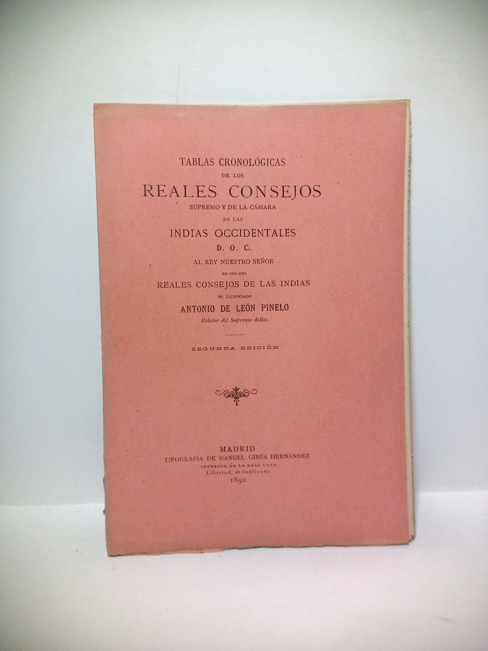 2ª Ed.- Madrid: Tip. de Manuel Ginés Hernández, 1892.- VIII,55 p.; 4º menor (20,1 x 14,2 cm); Intonso; Rústica Ed.- La primera Ed. de esta obra fue publicada en 1645 y se reedito a partir del único ejemplar conocido hsta la fecha. Los aficionados a los estudios históricos sobre América encontrarán condensado en estas Tablas todo lo que más dilatado constaría en la Historia del Real Consejo de Indias, obra que se ha perdido por desgracia.* CONQUISTA, PERIODO VIRREINAL E HISTORIAS GENERALES DE IBEROAMÉRICA