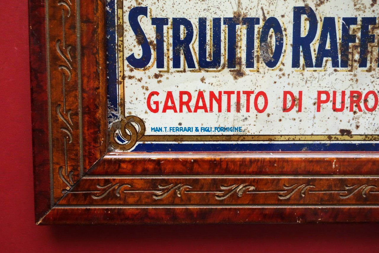 Grande targa litografica pubblicitaria su lamiera, † Brevetto della Real Casa - Villani premiata fabbrica salumi per l'esportazione Mantova strutto raffinato garantito di puro suino - primi anni del Novecento circa Man. Ferrari & Figli, Formigine, s. d. ma primi anni del '900 circa; bella targa pubblicitaria cromolitografica realizzata su lamiera, inserita entro cornice in legno. Al margine sup. della cornice gancetto metallico per affissione a parete. Cm 38x26,5 (cornice). † Condizioni di conservazione Targa cromolitografica complessivamente in buono stato con segni del tempo, alcune perdite di immagine e di colore dovute a piccole / minime abrasioni e ossidazione del metallo. Per ulteriori dettagli vedi foto. † Bellissima targa pubblicitaria cromolitografica, realizzata su lamiera dalla Man. Ferrari & Figli di Formigine (provincia di Modena). Originale. Condizioni come da foto. † SC05.L0081 N