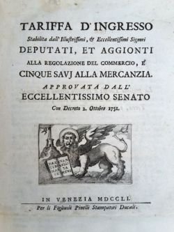 Tariffa d'ingresso stabilita dall'illustrissimi et eccellentissimi signori deputati et aggiunti alla regolazione del commercio, e cinque savi alla mercanzia approvata dall'eccellentissimo Senato con decreto 2 Ottobre 1751.