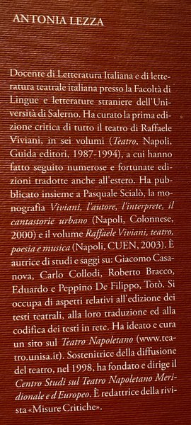 Antonia Lezza è professore associato di Letteratura italiana e di Letteratura teatrale italiana all'Università degli Studi di Salerno e ha un incarico di Storia del Teatro all'Università Suor Orsola Benincasa di Napoli. Ha curato con Pasquale Scialò la prima edizione critica del Teatro di Viviani in sei volumi, edito dalla Guida editori di Napoli; la monografia Viviani, l'autore, l'interprete e il cantastorie urbano (Napoli, 2000) e gli Atti della Giornata di Studio Raffaele Viviani. Teatro, poesia e musica (Napoli, 2003). Nel corso degli anni si è dedicata agli studi di letteratura teatrale, producendo una serie di saggi sul teatro di Carlo Goldoni, Collodi, Salvatore Di Giacomo, Roberto Bracco, Raffaele Viviani, Totò, Eduardo e Poppino De Filippo, Vincenzo Pirrotta; ha, inoltre, studiato Casanova e i suoi rapporti con il teatro europeo. Ha curato per Enciclopedia ofitalian L'iterar/ Studies diverse voci afferenti al teatro meridionale (New York, 2006). È ideatrice e responsabile del sito Teatro Napoletano e ha fondato nel 1998 l'Associazione culturale "Centro Studi sul Teatro Napoletano, Meridionale ed Europeo" di cui è presidente È membro del comitato scientifico della rivista «Misure Critiche».