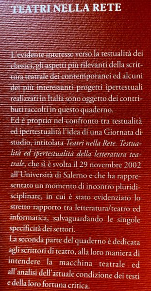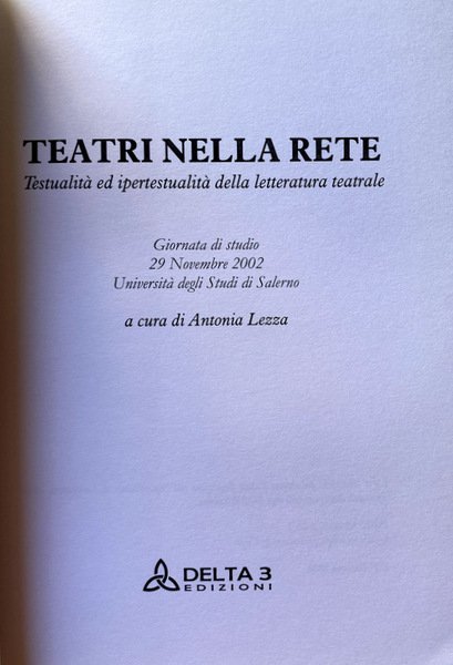 Titolo: Teatri nella rete. Testualità e ipertestualità della letteratura teatrale. Giornata di studio, 29 novembre 2002, Università degli studi di Salerno
