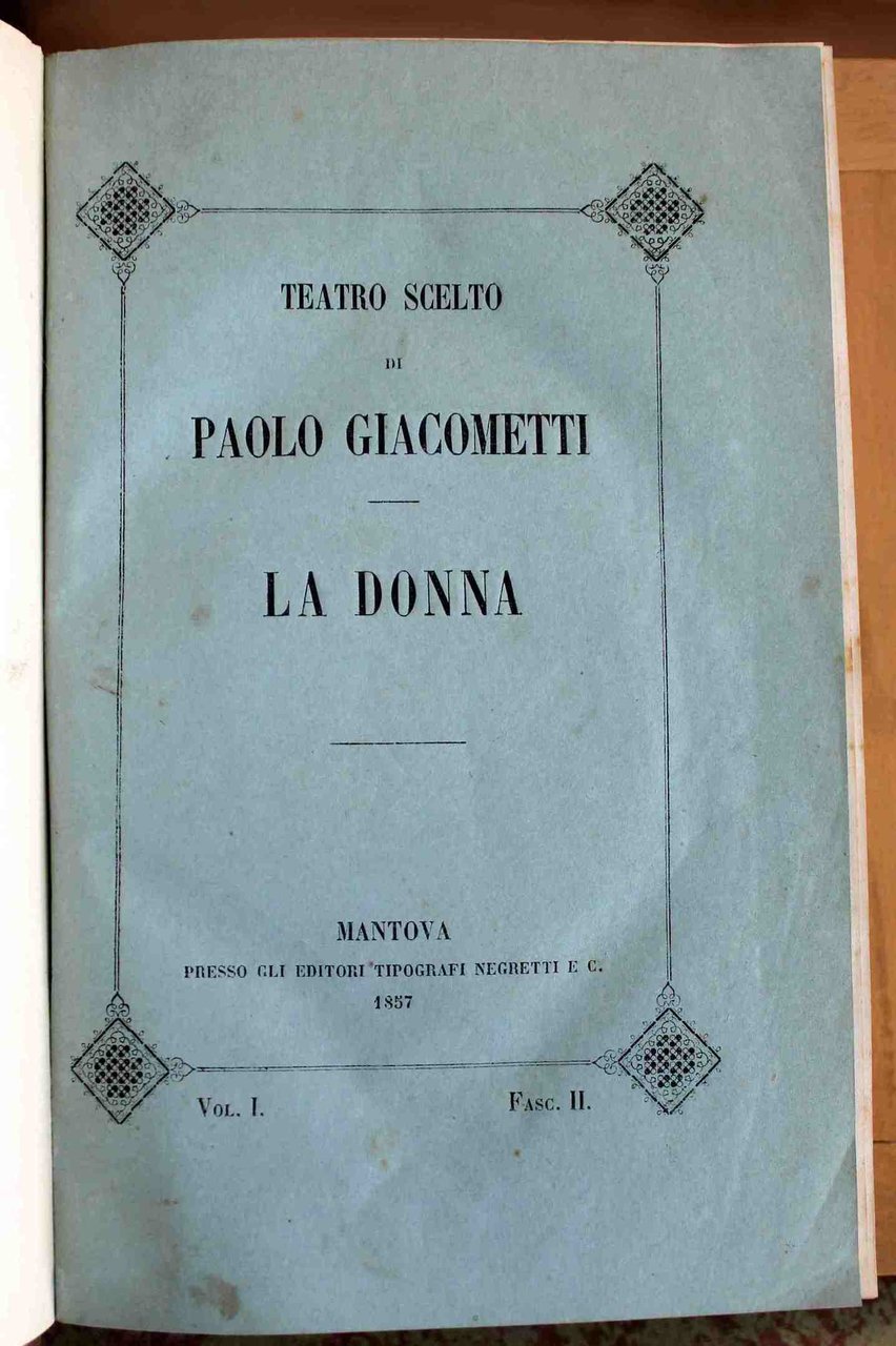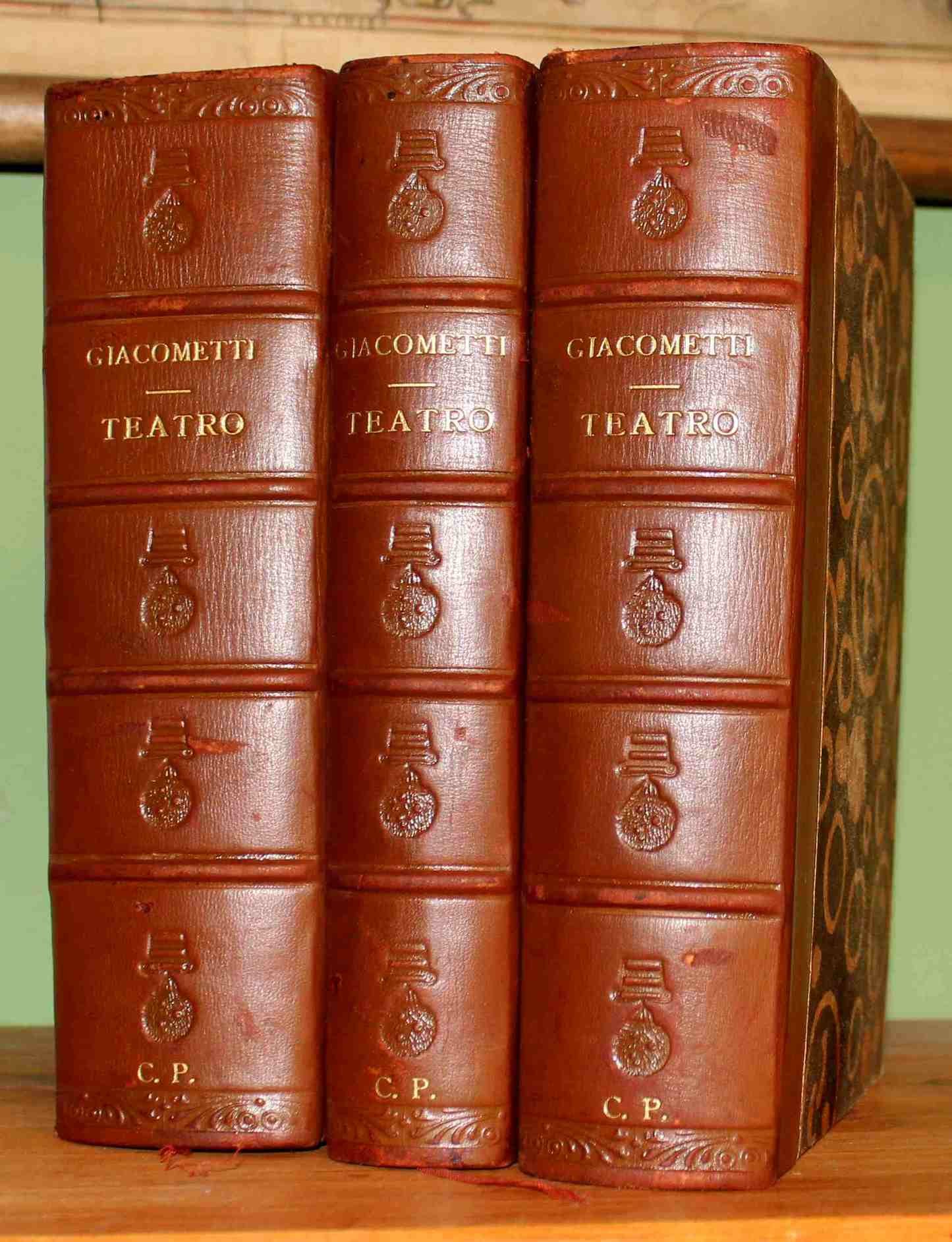 Cinque volumi leg. in tre tomi, contenenti 35 fascicoli (di 36). Leg. rigida mezza pelle dell'inizio del XX secolo. Dorsi a nervetti con titoli oro. Ogni fascicolo è completo della brossura editoriale a stampa. Copiain buono stato. TOMO I. Volume 1, pp . da p. 153 a 751, (1), fascicoli: [2] La donna: dramma intimo in tre atti preceduti da un prologo. [3] Carlo 2. Re d'Inghilterra. [4] Quattro donne in una casa. Commedia giocosa in 3 atti. [5] La colpa vendica la colpa. Dramma in 5 atti. [6] Camilla Faa di Casale dramma storico in 3 atti con prologo. [7] Un poema ed una cambiale. Commedia in due atti. [8]: Giuditta. Tragedia biblica in 5 atti con prefazione e note (Antiporta con il ritratto dell'autore). Manca il fascicolo: [1]: Torquato Tasso. Drama storico diviso in 7 atti - Volume 2, pp. 506, fascicoli: [9]: Per mia madre cieca! Dramma in due atti. [10] La donna in seconde nozze. Commedia in tre atti. [11] Lucrezia Maria Davidson. Dramma storico in quattro atti. [12] Elisabetta regina d'Inghilterra. Dramma storico in cinque atti. [13] Il poeta e la ballerina. Commedia in tre atti. [14]: La famiglia Lercari. Tragedia in cinque atti. [15] Inclinazioni e voti. Dramma in quattro atti. TOMO II. pp. da 507 a 606. Volume 3, pp. 559. fascicoli: [16]: Le tre classi della società. Commedia in quattro atti. [17] Bianca Maria Visconti. Tragedia in cinque atti. [18] Le metamorfosi politiche. Commedia satirica in tre atti e divisa in due epoche. [19] Siamo tutti fratelli/, ossia il villagio e la città. Dramma in tre atti con prologo. [20] Il fisionomista. Commedia in 4 atti. [21] La trovatella di Santa Maria. Dramma in tre atti. [22] Il milionario e l'artista. Dramma in quattro atti. [23] Cola di Rienzo l'ultimo dei tribuni. Tragedia in cinque atti. [24] La morte civile. Dramma in 5 atti. TOMO III. Volume 4, pp. 734; Volume 5, pp. 312. Contiene: [25] Isabella del Fiesco. Tragedia in cinque atti. [26] L' indomani dell'ubbriaco. Commedia popolare in 5 atti. [27] La moglie dell'esule. Dramma in cinque atti. [28] Luigia Sanfelice. Dramma storico in 4 atti e diviso in due parti. [29] Eponina. Tragedia in 5 atti con proemio istorico e note. [30] Corilla olimpica o L'ultima coronazione in Campidoglio. Dramma storico in cinque atti. [31] L' ultimo dei duchi di Mantova. Dramma storico in 5 atti. [32] Figlia e madre o le storie intime. Dramma in cinque atti. [33]: La benefattrice e l'ingrato. Dramma in quattro atti. [34/35]: Sofocle. Dramma storico in versi diviso in 5 atti. [36] Unità morale in famiglia. Commedia in cinque atti. Collezione quasi completa (manca la prima dispensa) delle opere teatrali di Paolo Giacometti (Novi Ligure 1816 - Gazzuolo 1882).