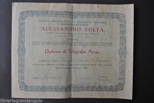 Telegrafo Telegrafisti Diploma Telegrafia Morse Istituto Volta Palermo 1932 | Libri antichi e moderni |