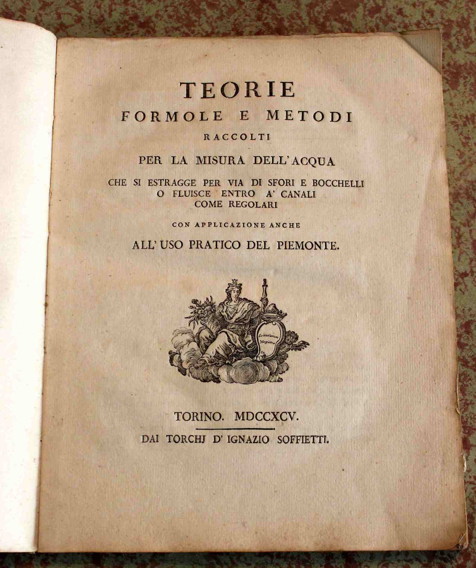 Teorie formole e metodi raccolti per la misura dell'acqua che si estragge per via di sfori e bocchelli o fluisce entro a' canali come regolari. Con applicazione anche all'uso pratico del Piemonte | Libri antichi e moderni |