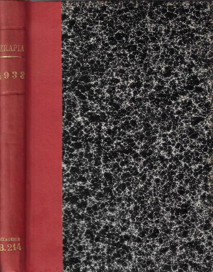 Annata completa del periodico mensile "Terapia" anno 1933 rispettivamente dal N. 163 al numero 174. Volume successivamente rilegato raccogliente i vari numeri. Coperta rigida lievemente ingiallita dal tempo con titoli oro al dorso presentante segni di usura ai margini ed ai piatti con conseguenti piccole e sporadiche macchioline di decolorazione. Il volume potrebbe contenere timbri ed etichette dell'Istituto Veneto, regolarmente acquisito dalla nostra libreria. Segno a matita e firma d'appartenenza a penna al frontespizio. Pagine brunite dal tempo, in particolare ai tagli e sporadicamente fiorite. Numerazione delle pagine consecutiva tra le uscite. Numero pagine complessive 384.