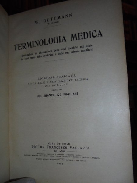 Derivazione ed illustrazione delle voci tecniche più usate in ogni ramo della medicina e delle sue scienze ausiliarie. Edizione italiana sulla XXIII e XXIV edizione tedesca. W. GUTTMANN (W. Marle) - Milano, Casa Editrice Francesco Vallardi, 1932. In-8° grande, tela con titolo in oro sul dorso (leggermente sbiadito) e sul piano. 1460 pp. con 600 figure curata dal Dott. Gianfelice Fogliani. Ben conservato. Neg. mob. nero