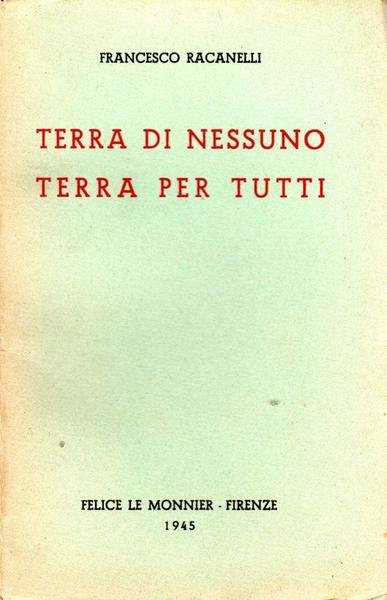 Terra di nessuno terra per tutti, prima edizione novembre 1945, pp. 80, formato 11,5 x 18.<BR>Copertina morbida di colore verde con titoli in nero e rosso al piatto anteriore e sul dorso. In prima pagina presente dedica dell'autore all'editore Enrico Vallecchi, datata 3 aprile 1946. <BR>Condizioni molto buone.