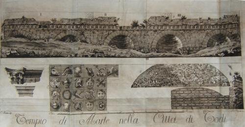 Cm. 27, pp. xii, + 125 (3). Con una grande tavole incisa in rame e più volte ripiegata fuori testo. Legatura coeva in mezza pelle con punte, dorso liscio con filetti in oro. Tagli colorati. Carte a tratti un po' fiorite, peraltro esemplare genuino e marginoso, in buono stato di conservazione. Timbretto di possesso della biblioteca privata Colonna da cui il volume proviene. Saggio che attribuisce questi imponenti resti presenti in Todi a un tempio di Marte. In realtà fu poi appurato trattarsi di un grande muro di contenimento. Cfr. Borroni (il quale cita la carta); non in Cicognara.