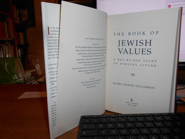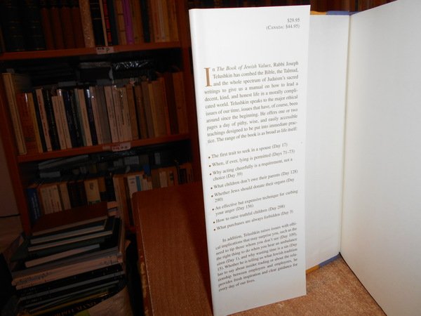 RABBI TELUSHKIN JOSEPH. New York, Bell Tower, 2000. The Book of JEWISH VALUES. A day-by day guide to ethical living. In-8°, cartonato edit. con titolo in oro al dorso, sovracopertina ill. a col. xxii, 519, (1) pp. Come nuovo. Uff. stanzetta mob. sinistra I - 4 carc.