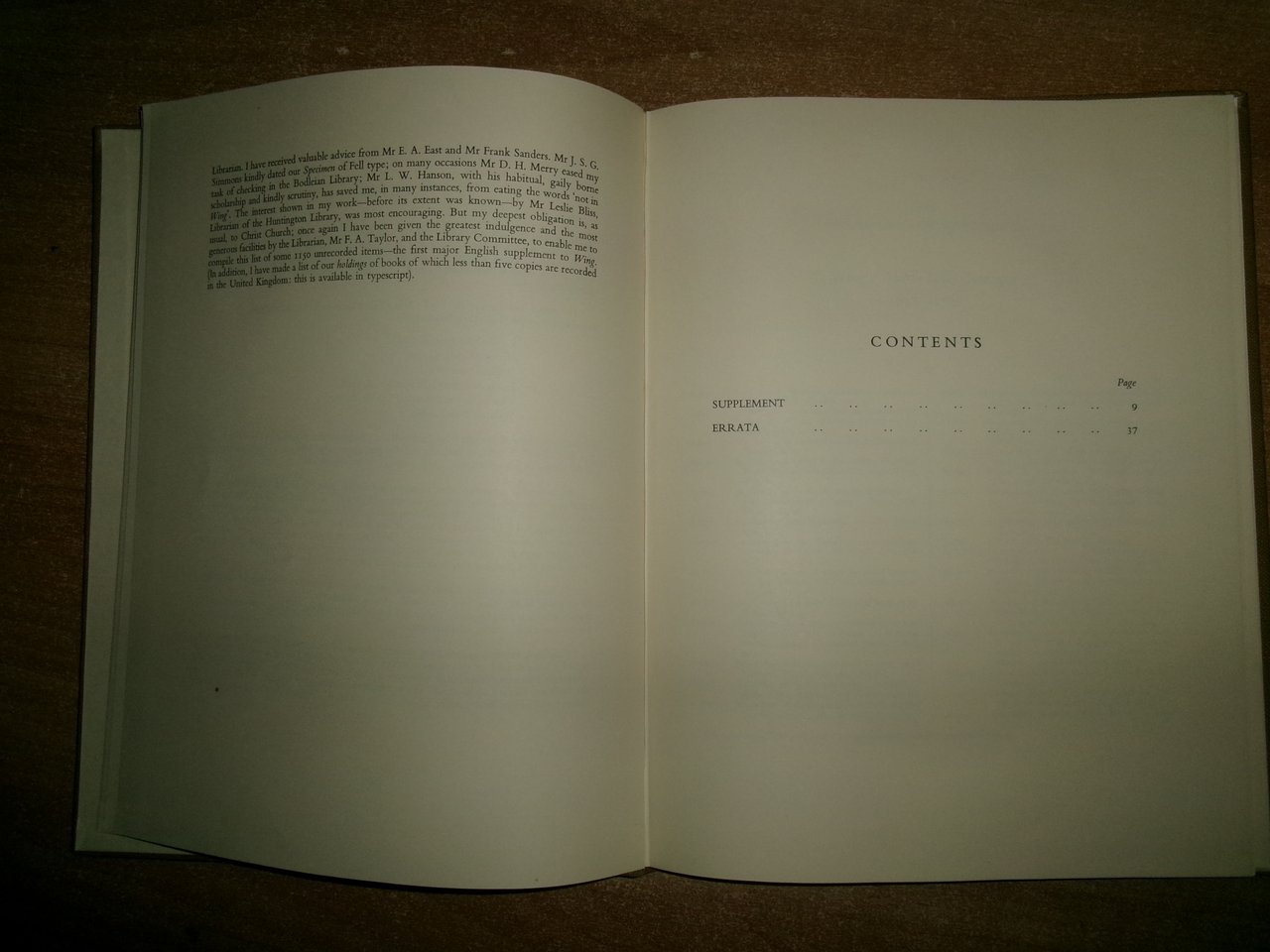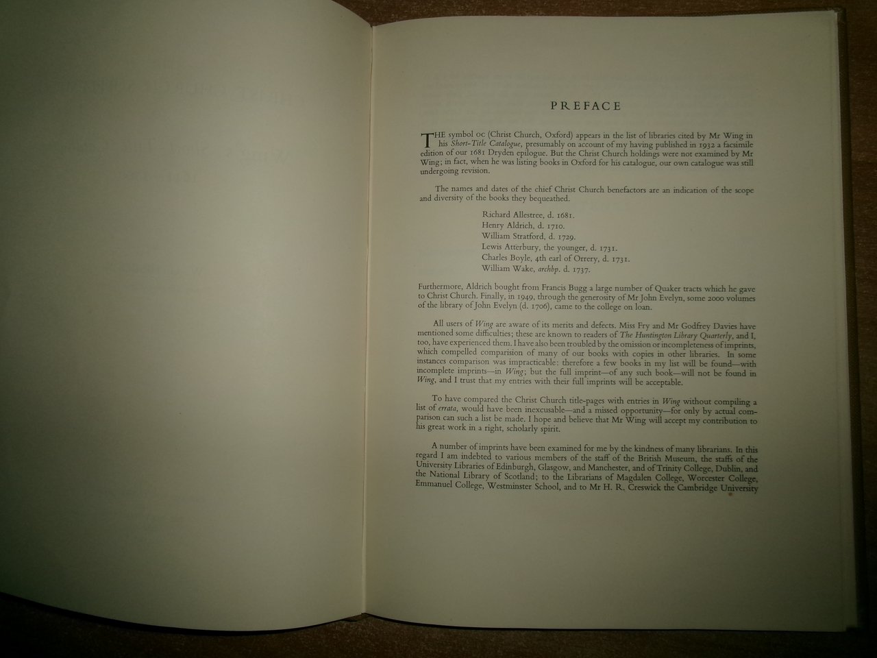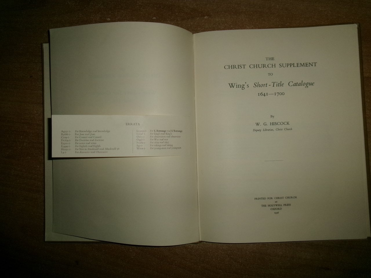 The Christ Church Supplement to Wing's Short-Title Catalogue. Hiscock, W. G.1956