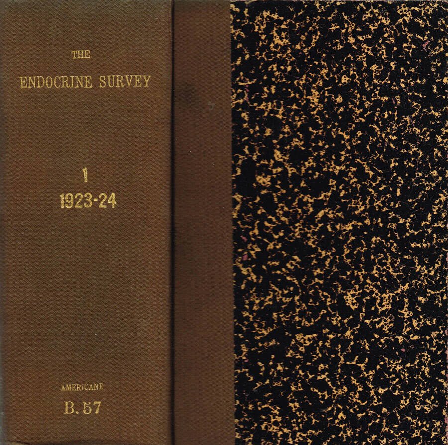 Volume I completo composto da quindici fascicoli, dal N. 1, ottobre 1923 al No. 15, dicembre 1924, rilegati in un unico tomo, del periodico mensile The Endocrine Survey - Continuing The International Digest of Organotherapy, redattore capo: Henry R. Harrower, M. D. Volume degli anni '20 del '900 in stato discreto, rilegato con coperta, non coeva, in mezzatela con angoli, piatti marmorizzati, sul dorso caratteri dorati in bassorilievo, qualche segno del tempo, tracce di fioritura sparsa, tagli appena ambrati, quello di piede con graffi, quello di testa di colore bordeaux. pagine ben conservate, prime e ultime appena ambrate. Il rilegatore ha mantenuto all'interno del volume il piatto anteriore originale del I.o fascicolo, in cartoncino, con catalogazione bibliotecaria manoscritta e qualche appunto a matita. Presenta alcune inserzioni pubblicitarie. Numero Pagine 630, numerazione delle pagine in sequenza