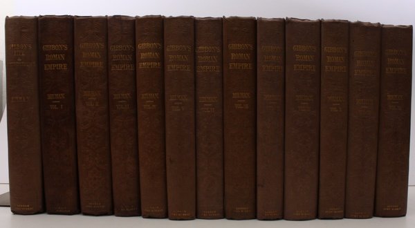 13 vols., 8vo., First Edition thus, with engraved portrait frontispiece (in 'Life') and 14 engraved maps, (the majority folding and MANY COLOURED BY HAND IN OUTLINE), the maps generally lightly foxed but crisply folded, some mild and occasional offsetting; contemporary plum cloth, boards elaborately framed and blocked in blind, gilt backs, primrose endpapers, uncut, one volume LARGELY UNOPENED, two volumes expertly recased with original endpapers preserved, backs moderately and uniformly sunned (but all gilt wholly legible), fore-edges lightly spotted, a remarkably bright, crisp, clean extended set in largely unrestored publisher's binding. All volumes complete with half-titles; most volumes with publisher's catalogues (variously dated 1838-39) at end, confirming early issue; tenth volume with publisher's advance notice slip (Milman's History of Christianity and Life of Gibbon) mounted facing half-title; twelfth volume with separately printed errata slip mounted facing end of Contents. Maps and Catalogues as follows: Vol.I: 2 folding, 8pp. March 1838 ; Vol.II: 1 folding; Vol.III: 2 full-page, 12pp. May 1838; Vol. IV: 1 folding, 12pp. June 1838; Vol. V: 1 folding, 12pp. August 1838; Vol.VI: 1 folding, 4pp. n.d.; Vol. VII: 1 folding, 12pp. October 1838; Vol. VIII: 1 folding, 32pp. October 1838; Vol.IX: 1 folding, 6pp. December 1838; Vol. X: 1 folding, 32pp. December 1838; Vol. XI: I folding, 8pp. January 1839; Vol. XII: 1 folding, 8pp. January 1839). The portrait of Gibbon is by Scriven after Reynolds. A CRISP EXTENDED SET OF THE FIRST APPEARANCE OF MILMAN'S 'GIBBON' IN LARGELY UNRESTORED PERIOD CLOTH BINDING AND AS SUCH MOST UNUSUAL.
