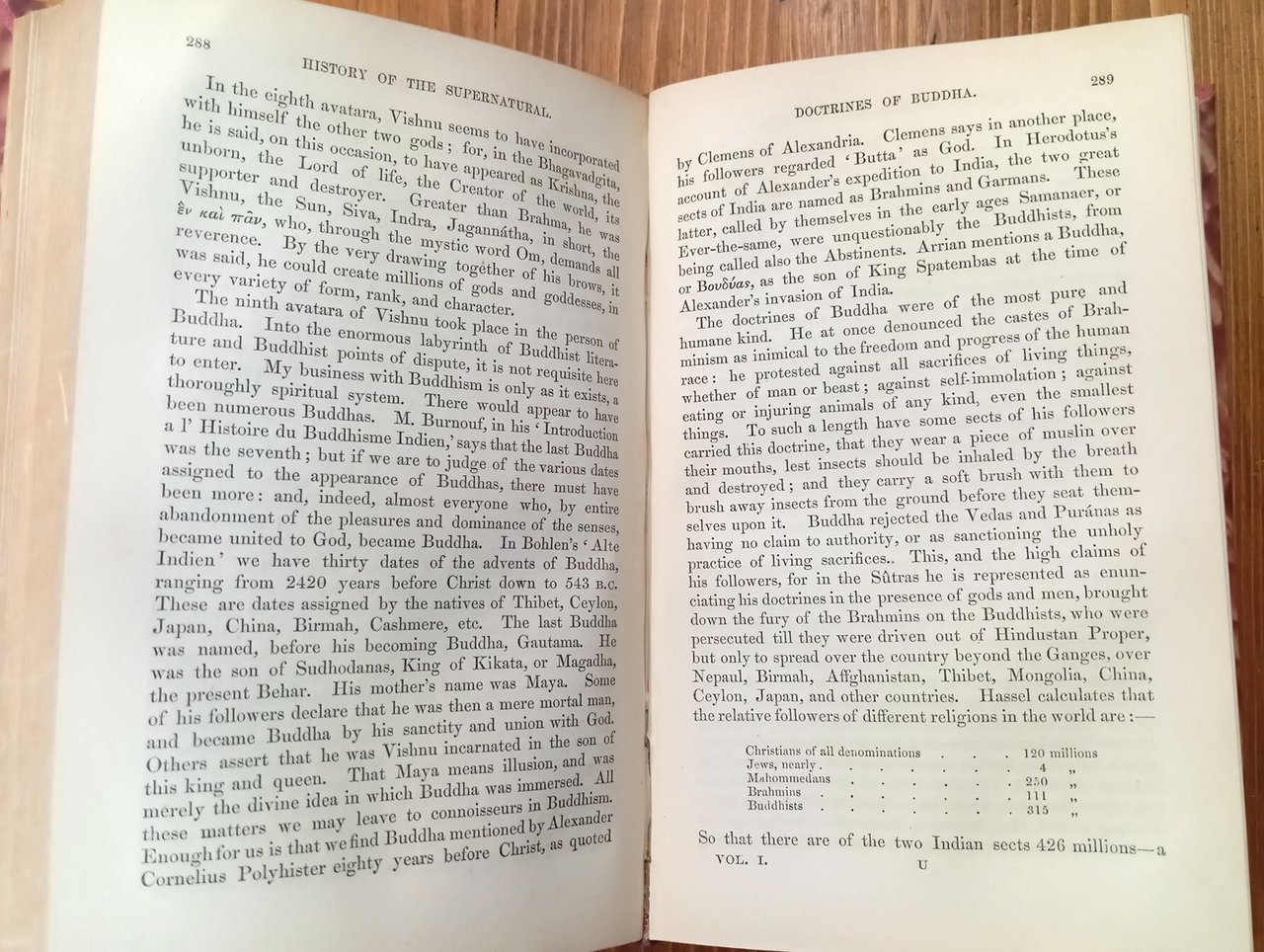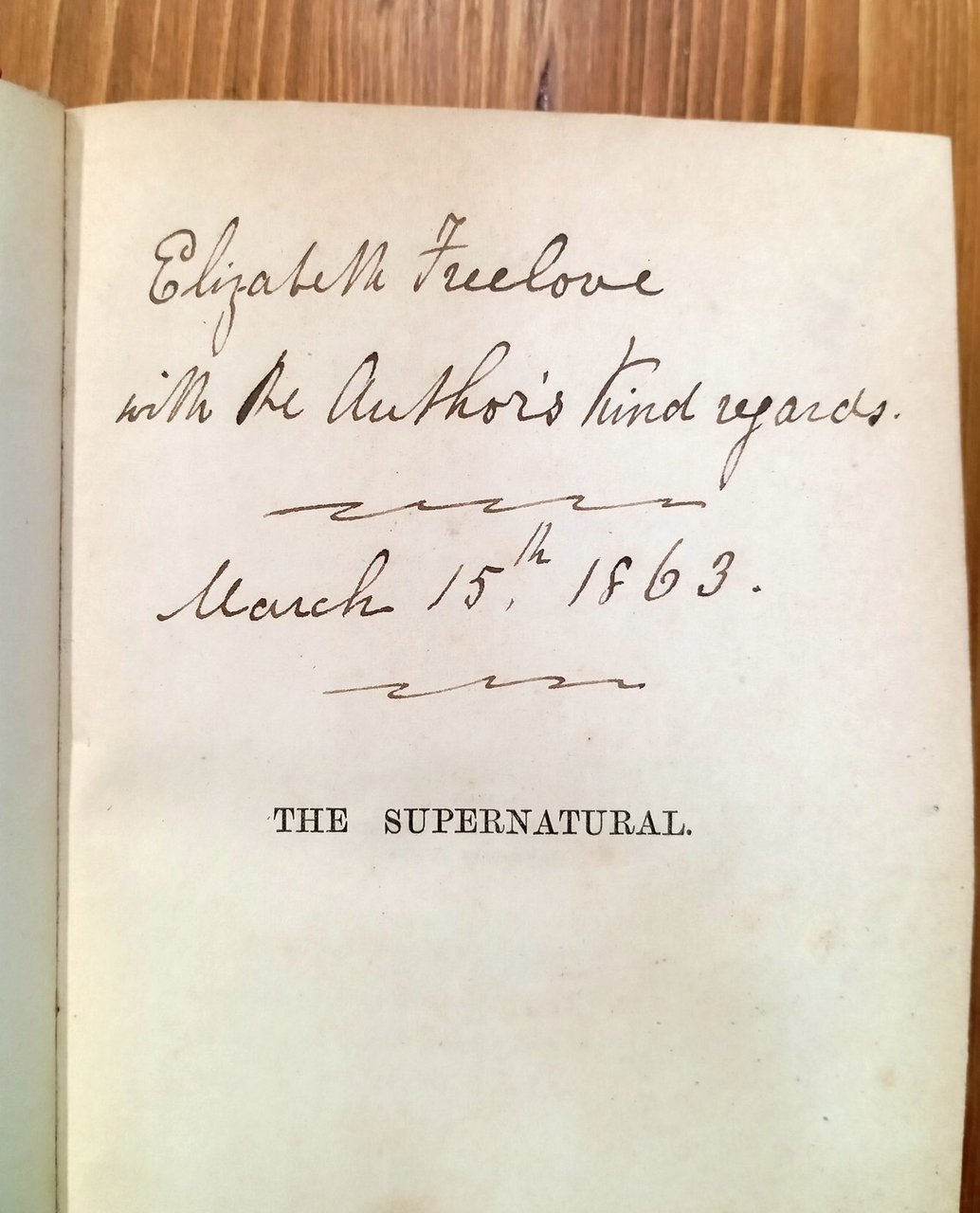 Edizione originale. Primo dei due tomi dell'opera. Alla prima carta bianca, coeva dedica dell'autore (che si firma solo come tale) / Dedicated and signed by the author - Volume rilegato in mezza tela amatoriale, xix-489 pagine. Esemplare ottimamente conservato di un saggio piuttosto raro, benché scompleto -- Capitoli di questo primo volume / Contents of the first volume: An apology for faith in the Nineteenth Century - Spiritualists before the American development - Manifestations of the supernatural in Germany - The supernatural in Switzerland and France - The supernatural in the Bible - The supernatural of the apocrypha - The supernatural of the New Testament - The supernatural in the ancient nations - The supernatural in Assyria, Chaldea, and Persia - The supernatural of ancient Egypt - The supernatural in ancient India and China - The supernatural in ancient Scandinavia - The supernatural in Greece - The supernatural in ancient Rome - The same faith continues in all these nations to the present time