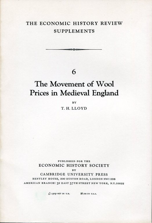 No marks or inscriptions. No creasing to covers or to very slightly sunned spine. A very clean very tight copy with bright unmarked boards and no bumping to corners. 75pp. A study of wool production and prices over the period 1200-1500. Includes details of the areas of the country incorporated into the annual mean values. Scarce in the UK.