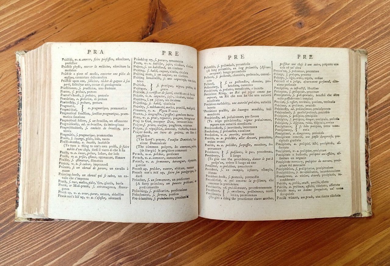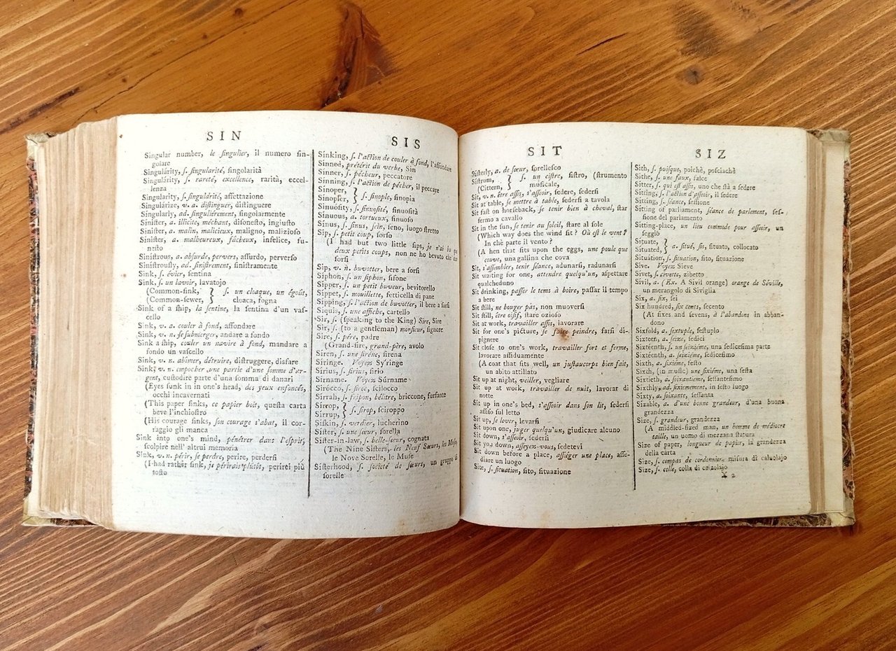 "Carefully compiled from the dictionaries of La Crusca, Dr. S. Johnson, the French Academy, and from other dictionaries of the best authorities. In which the parts of speech are properly distinguished, and each word accented according to its true and natural pronunciation. To which is prefixed a new compendious Italian grammar - The second edition, corrected and improved" - Secondo dei 3 volumi dell'opera, ovvero la parte di dizionario che dall'inglese fornisce le traduzioni francese e italiana. Volume rilegato in mezza pelle con titolo calligrafico al dorso, piatti marmorizzati, circa 580 pagine non numerate, stampate su due colonne contrassegnate dalle prime tre lettere attinenti ai vocaboli su ciascuna colonna. Ordinari segni d'uso e del tempo, nel complesso esemplare in buono stato di conservazione di una non comune settecentina, ancorché scompleta.