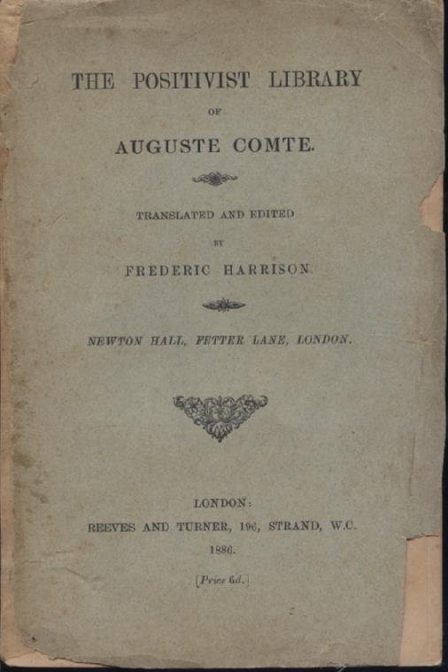 In-8°, pp. 41, (5), brossura editoriale (con restauri). Discreto stato. Prima edizione in lingua inglese, nella traduzione e per le cure dell'Harrison (Londra, 1831-Bath, 1923), uno dei principali discepoli britannici di Comte. Elenco ragionato stilato dal celebre pensatore nel 1851 e che egli chiamò 'The Positivist Library in the Nineteenth Century', consistente di 270 opere di 140 autori formanti un'ideale biblioteca positivistica, col proposito 'to guide the more thouthful minds among the people in their choice of book for constant use'. La lista fu pubblicata nel quarto volume (1854) della 'Politique Positive'. 'Comtes teaching, centred as it was upon the phenomena of human life, fell in with the views of those who were dissatisfied with social conditions, and anxious to promote reforms. Harrison, like a few others, eventually accepted positivism as a religion and as a substitute for belief in the supernatural' (DNB).
