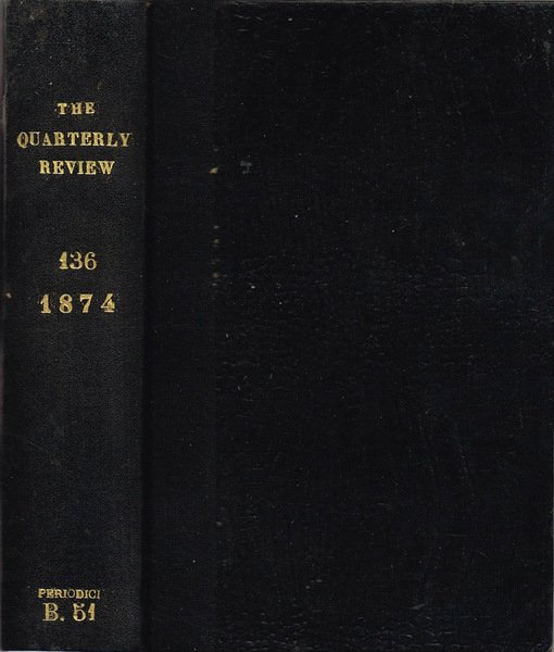 Anno 1874 incompleto, presenti fascicoli NN. 271 gennaio e 272 aprile, rilegati in un unico tomo, Vol. 136 del periodico The Quarterly Review. Volume della seconda metà dell'800 in 8.o, stato discreto, coperta, non coeva, in mezzocartone rigido goffrato, piatti in cartone rigido goffrato, sul dorso caratteri dorati in bassorilievo, alcuni segni del tempo, tracce di fioritura sparsa, tagli appena ambrati, quello di testa ingrigito, pagine in buono stato, prime e ultime lievemente brunite, minima presenza di gora. Presenta segnatura e richiami, appunto a matita su frontespizio, testo posto su una e due colonne. Numero Pagine 598, numerazione delle pagine in sequenza