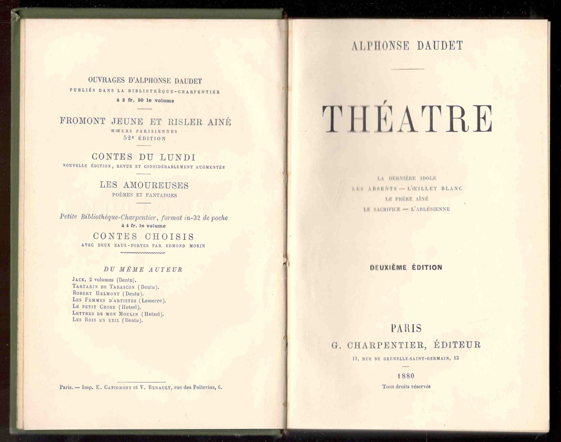 Théatre. La dernière idole. Les absents. L'oeillet blanc. Le frère aîné. Le sacrifice. L'arlésienne. Deuxième édition | Libri antichi e moderni | Daudet, Alphonse
