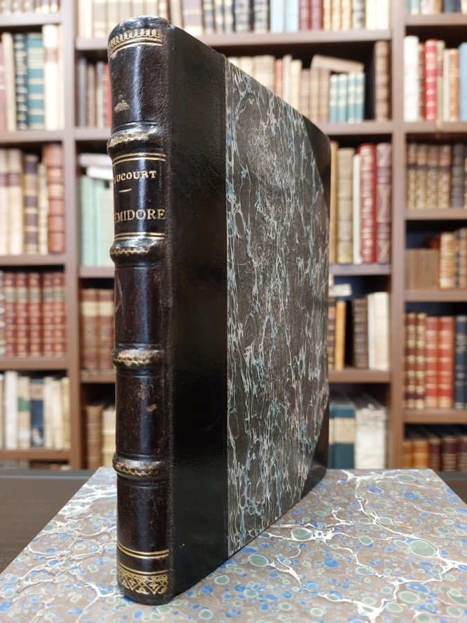 <span style="font-style: normal;">In-8° (cm. 19), bella legatura coeva d'amatore in mezza pelle nera ad angoli, dorso a nervi con titolo in oro e fregi in oro, taglio superiore dorato, piatti e risguardi marmorizzati; conservata la brossura originale a stampa illustrata a colori; pp. 214 [8] </span><i>sur vélin des papetieres Outhenin-Chalandre</i>, in barbe, in ottimo stato (lievi bruniture e sporadiche fioriture). Opera illustrata con disegni a colori nel testo in testatine e ai finalini, capilettera figurati ed alcune tavole fuori testo a colori originali di Stick protette da velina, di cui 1 all'antiporta. Marca tipografica in silografia al frontespizio. Tiratura limitata di 1000 esemplari, il nostro n. 182. In ottimo stato, conservato in custodia cartonata marmorizzata con interno in velluto. (NR2)