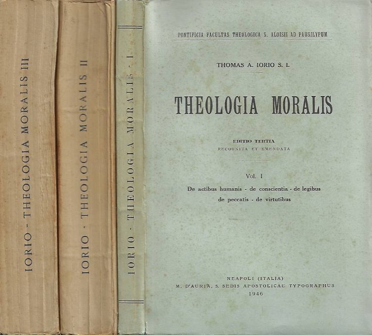 Opera completa in 3 volumi. Coperte naturalmente imbrunite e segnate da fattore tempo. Legature allentate (soprattutto al secondo volume), tagli imbruniti ed irregolari, pagine con imbrunitura. Libri completamente fruibili, con note a piè di pagina. Pubblicazione della Pontificia Facultas Theologica S. Aloisii ad Pausilypum, numero complessivo pagine 2001 [volume I] Anno 1946, "Theologia Moralis. Vol. I: De actibus humanis - De conscentia - De legibus - De peccatis - De virtutibus", terza edizione rivista e corretta, numero pagine 264 (XIX, 245) [volume II] Anno 1939, "Theologia Moralis (iuxta Methodum compendii Ioannis P. Gury S.I. et Raphaelis Tummolo S.I.). Vol. II: De praeceptis Decalogi et Ecclesiae - De prohibitione librorum - De censuris - De iustitia et iure - De contractibus - De statibus particularibus", sesta edizione (la seconda riveduta) corretta e sistemata in un nuovo ordine, numero pagine 839 [volume III] Anno 1940, "Theologia Moralis (iuxta Methodum compendii Ioannis P. Gury S.I. et Raphaelis Tummolo S.I.). Vol. III: De Sacramentis in genere et de Sacramentalibus - De baptismo - Confirmatione - Eucharistia - Paenitentia - Indulgentiis - Extrema unctione - Irregularitatibus - Matrimonio", sesta edizione (la seconda riveduta) corretta e sistemata in un nuovo ordine, numero pagine 898