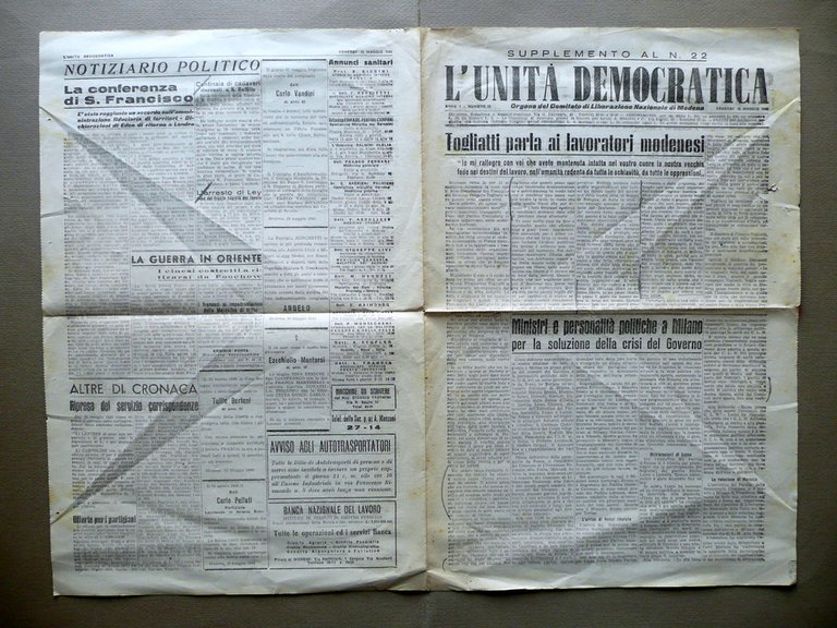 Giornale (supplemento), Togliatti parla ai lavoratori modenesi" in "L'Unità Democratica" Organo del Comitato di Liberazione Nazionale di Modena Supplemento al N. 22 Anno I - Venerdì 18 maggio 1945 Modena 1945; cm 42,5x28,5; pp. 4 (bifolio); numero completo. Condizioni di conservazione Esemplare ben conservato con tracce d'uso, pieghe di conservazione, alcune piccole leggerissime bruniture; qualche segnetto e sottolineatura a matita (vedi foto); poche lievi tracce di pieghe / pieghette. Numero completo. SC03.D12788 N "