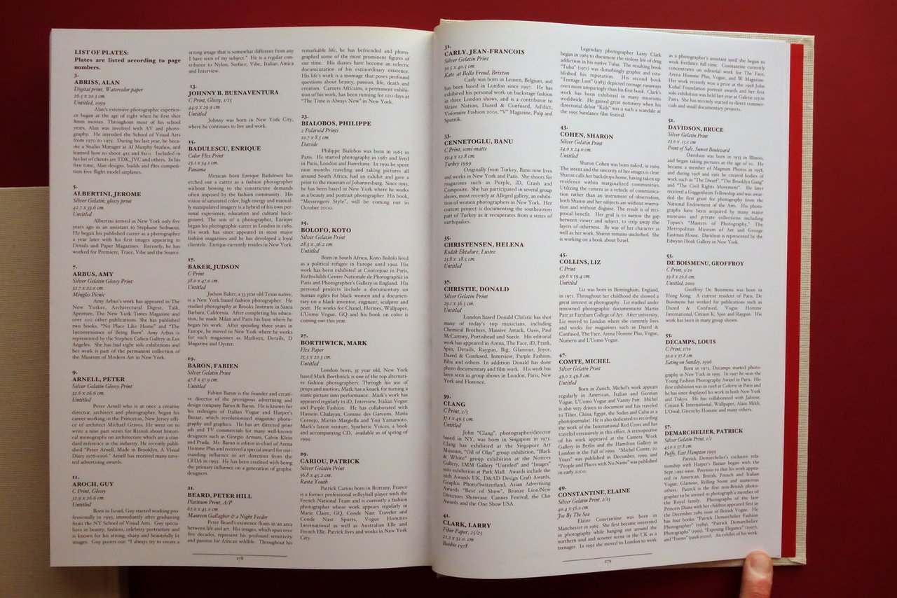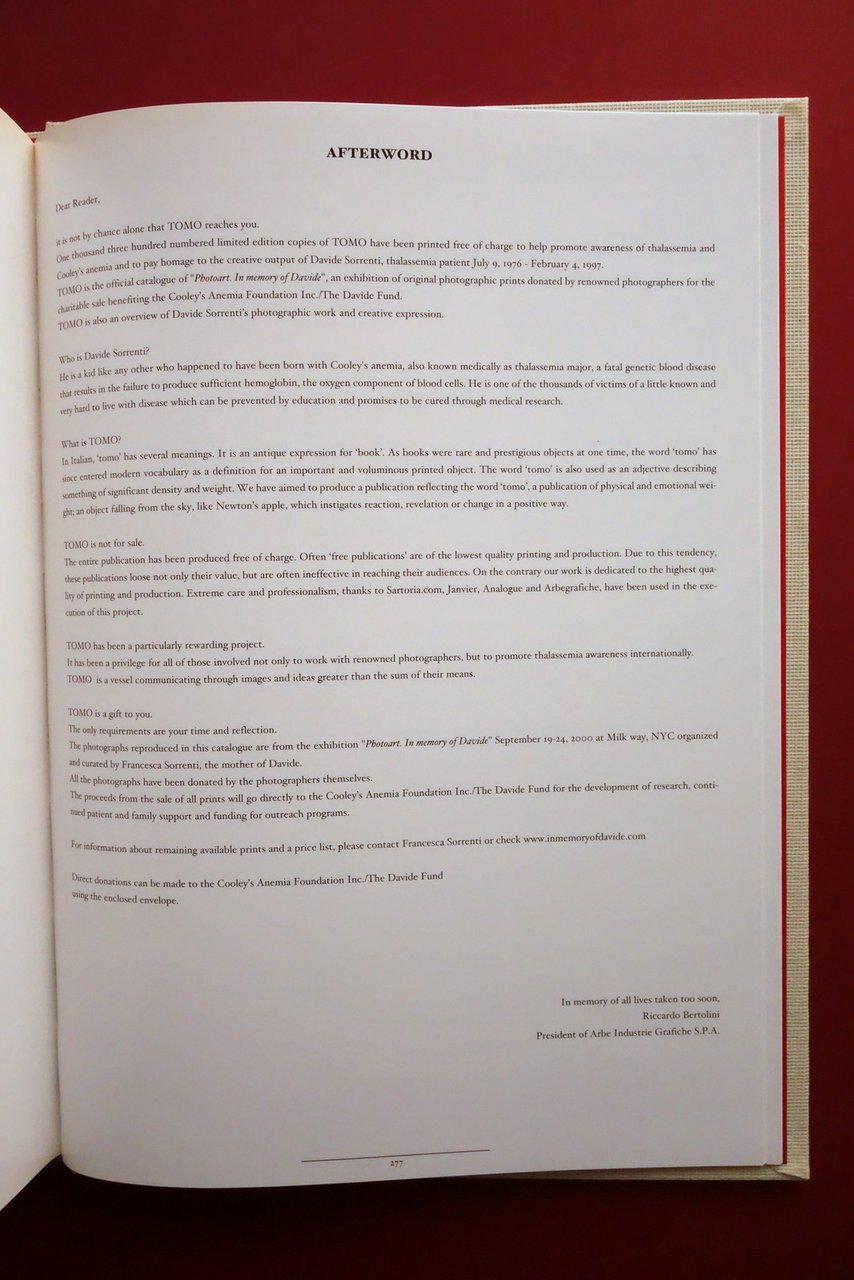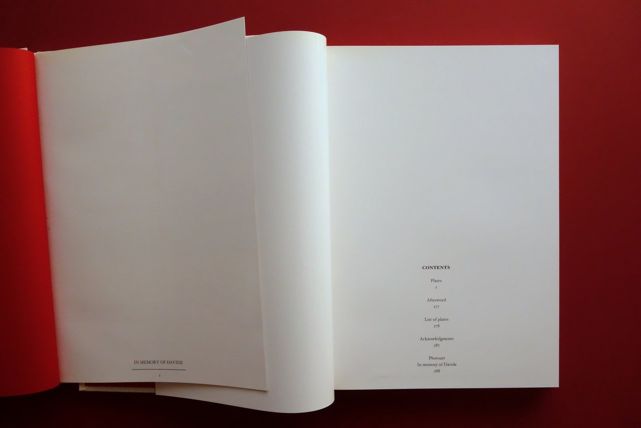 AA. VV., Giorgio de Mitri e Francesca Sorrenti (a cura di), † Tomo - Photoart. In memory of Davide - opera completa in 2 volumi Arbe Industrie Grafiche, Modena 1996-1997; cm 34,5x25; pp. 112 con 100 belle illustrazioni fotografiche a colori a piena pagina e su doppia pagina (volume I - in memory of Davide); pp. 288 con 137 belle illustrazioni fotografiche a colori a piena pagina, realizzate da celebri fotografi dell'epoca quali David Lachapelle, Tommaso Lagrange; Amy Arbus; Bruce Weber, Terry Richardson, Peter Lindbergh, Justine Parsons, ecc. Legatura in tutto cartonato ed. telato muto. Opera completa in due volumi, inseriti entro cofanetto ed. in cartonato telato. Edizione fuori commecio di 1300 copie (la nostra non presenta numerazione). Testi in lingua inglese. Condizioni di conservazione Esemplare in ottime condizioni con minime tracce di utilizzo. Interni dei volumi in ottime condizioni. Cofanetto ed. anch'esso molto ben conservato con solamente pochissimi trascurabili accenni di sporco. Rara pubblicazione realizzata in ricordo della scomparsa di Davide Sorrenti, promettente e talentuoso fotografo italiano che visse la maggior parte della sua vita negli USA, a New York. Sorrenti, affetto da talassemia - maior o anemia di Cooley, scomparve a soli 21 anni. La pubblicazione Ë suddivisa in un tomo che raccoglie 100 belle illustrazioni fotografiche di scatti del giovane Sorrenti, e da un secondo ampio tomo che raccoglie 137 illustrazioni fotografiche a colori di fotografie eseguite da celebri fotografi dell'epoca. Tali fotografie, nella loro versione originale, furono appositamente realizzate per la mostra commemorativa Photoart. In memory of Davide" del 2000 e il ricavato delle loro vendite devoluto alla Cooley Anemia Fundation Inc. per la ricerca sulla anemia di Cooley. Per un elenco dei fotografi coinvolti nell'iniziativa vedi foto indice. Bellissima raccolta fotografica edita in 1300 esemplari. † SETT229.L24991 N "