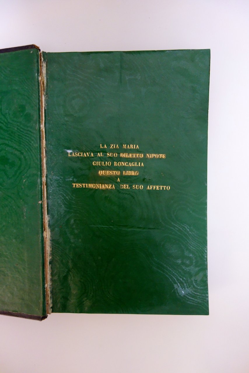 Luigi Sacchi Editore, Milano, 1844; cm 26x16,5; pp. XCIV; 278 (vol. primo); pp. 386 (vol. secondo), con numerose belle illustrazioni e fregi calcografici in b/n nel t.; elegante legatura d'epoca in piena pelle, con fregi impressi in oro al dorso e ai piatti; tagli dorati. Al risguardo anteriore bella dedica impressa in oro (lascito personale del libro da zia a nipote). Opera completa in due volumi, rilegati insieme.
