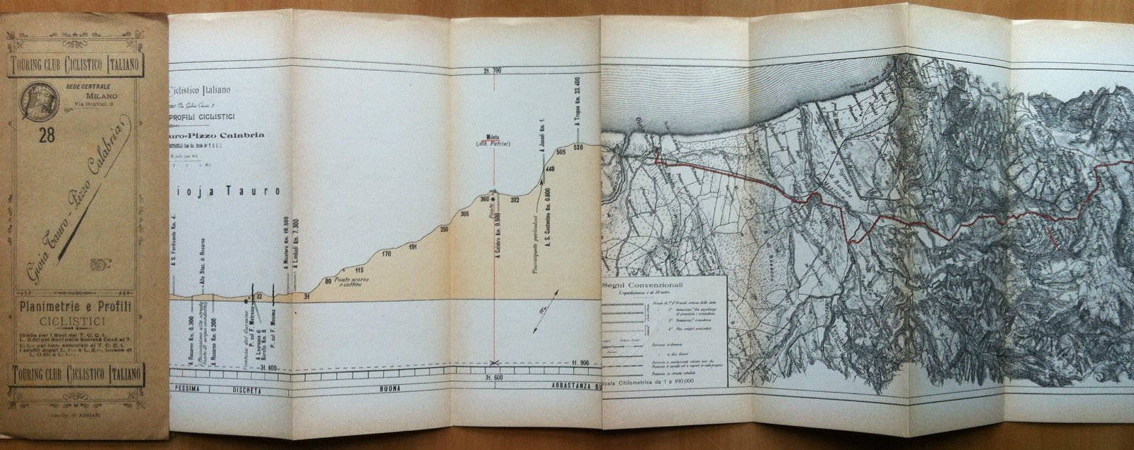 TOURIGN CLUB CICLISTICO ITALIANOGIOIA TAURO - PIZZO CALABRIAN^ 28Planimetrie e profili ciclisticiopuscolo originale d'epocaformato cartina da aperta 21x97 in scala 1:125000percorso verificato sul territorio nel 1897in ottimo stato (20 g)E15671