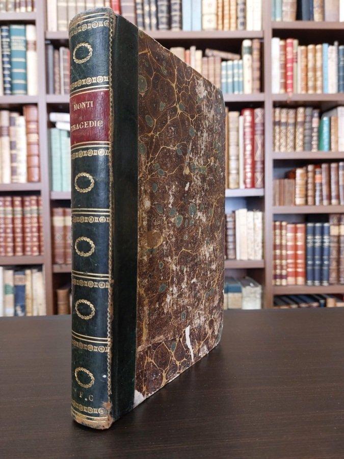 <span style="font-style: normal;"><span style="font-style: normal;">In-8° (cm. 24,2), legatura coeva in mezza pelle verde ad angoli (alcune abrasioni ai piatti) con titolo in oro su tassello rosso, filetti e fregi oro al dorso; pp. 323 [1] in barbe, in stato molto buono (alcune fioriture); 3 tavole in rame fuori testo precedenti ciascuna tragedia: </span><i>Aristodemo</i>, <i>Cajo Gracco</i>, <i>Galeotto Manfredi</i>. </span>«Edizione quinta fiorentina riveduta dall'autore<span style="font-size: 13.3333px;">»</span>. Esemplare molto buono. (NA1)