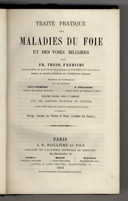 Paris, J. B. Baillière et fils, 1866, in-8, solida legatura coeva in mezza pelle verde, titolo e filettature oro al dorso, pp. XV, (1), 880. Con 158 illustrazioni in b.n. nel testo. L'internista tedesco Frerichs (1819-1885) fu uno dei fondatori della patologia sperimentale, in particolare nel campo della nefrologia e delle malattie epatiche. Ottime condizioni.
