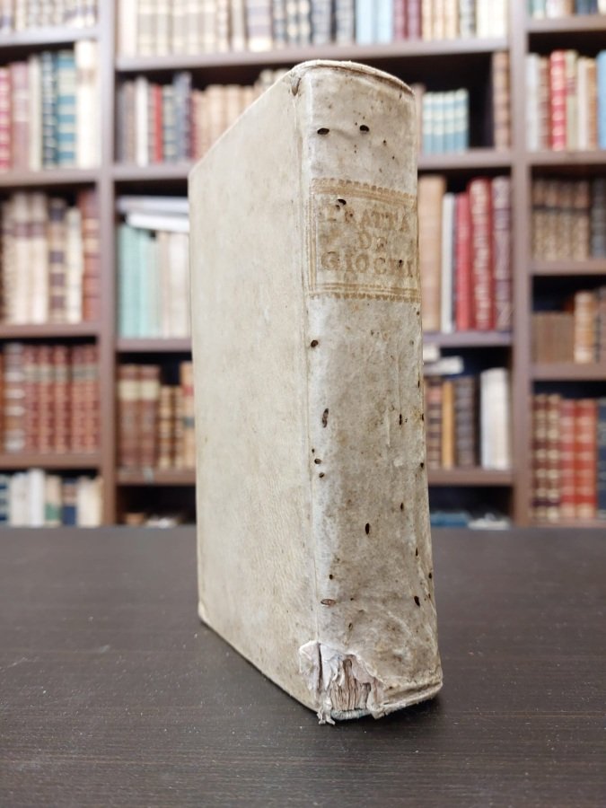 In-12° (cm. 15,5), legatura coeva in p. pergamena rigida con titolo in oro al dorso (stanca, con usure e strappetti), tagli marmorizzati; pp. XXIV, 396 [ma 408], [2]; carta in buono stato (poche sciolte o incollate al margine interno), lievissime bruniture, firma di possesso al frontespizio. Edizione originale assai rara. Si distinguono i giochi di strategia, di fortuna e combinati. Esemplare discreto. (SL2)