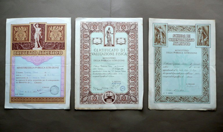 Tre diplomi, Certificato di Valutazione Fisica Scheda di Orientamento Atletico Brevetto Atletico - Tre diplomi / certificati con bella grafica a colori, rilasciati alla medesima persona Datati Torino, 1954 - 1956 - 1959 I.P.S. - Off. Carte Valori, Roma; tre diplomi / certificati a stampa su carta, datati rispettivamente 1954-1956-1959; sezioni bianche compilate manualmente; presenti timbro e firma che ne certificano la validità (vedi foto). Bella grafica a colori. Cm 36x27. Condizioni di conservazione Esemplari tutti e tre ben conservati con tracce d'uso, leggera piega centrale di conservazione, alcune piccole lievi bruniture; margini e angoli con pochi minuscoli strappetti e qualche lieve traccia / accenno di pieghetta (vedi foto). Bella grafica a colori. SC03.D12215 N