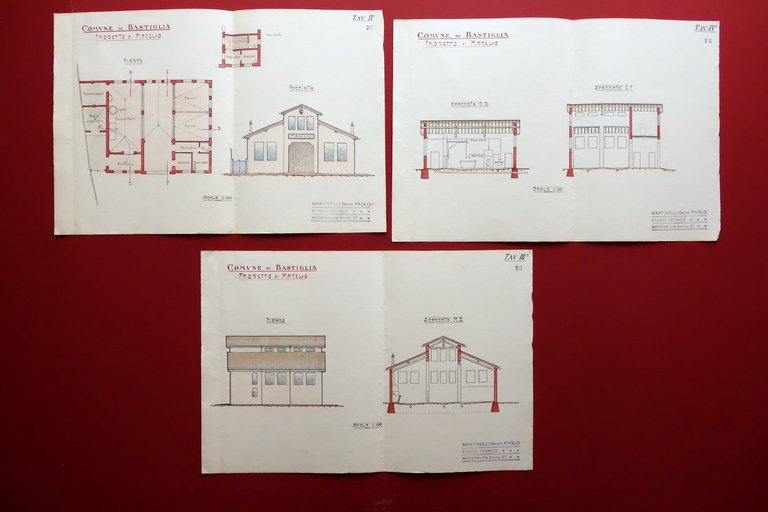 Tre tavole, Comune di Bastiglia progetto di Macello tre tavole realizzate a mano con pianta e spaccati dell'edificio scala 1:100 S. d. ma primo Novecento circa; tre tavole a colori relative a un progetto di edificazione di macello nel comune di Bastiglia (provincia di Modena), con spaccati e pianta dell'edificio. Tutte e tre le tavole di cm 27x40. Condizioni di conservazione Tutte in buone condizioni con normale piega longitudinale per conservazione, margine sinistro con traccia di piega, margine destro con poche minuscole irregolarità. Per ulteriori dettagli vedi foto. Tre belle tavole a colori relative al suddetto progetto, numerate II-III-IV. Tutte recano il timbro del realizzatore Paolo Martinelli - Studio Tecnico - Modena". SC03.D18719 N "