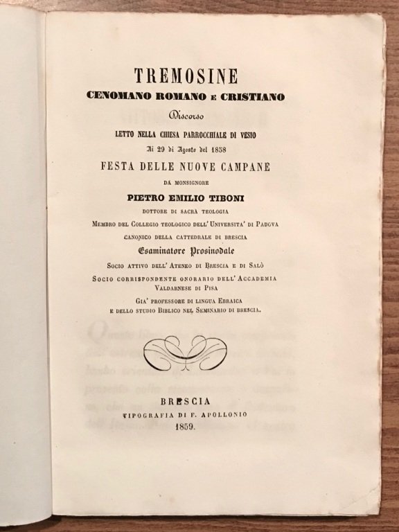 Tremosine cenomano romano e cristiano. Discorso letto nella Chiesa parrocchiale di Vesio ai 29 di Agosto del 1858 festa delle nuove campane [.]. | Libri antichi e moderni | Tiboni Pietro Emilio.