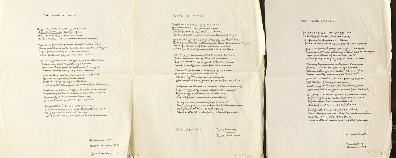 I ed., ed. d'arte "illustrated by Zwy Milshtein, printed by hand" (colophon). Testo in inglese. Contents: The Gossip of the Dream - Invocation - Christmas Evein a Dive - The Pickup - A Face from the Past - Lovers in the Park - A Wineglass Full of Snow - Biscay Full of Whales - Opposites Reconciled - Cold Attic - New Year's Eve - The Change at Waking - The green Oasis - Brooches - Punks in the Kings Road - The Dictator Dying The Dictator Dead - The Menhir - A Pair of Mules - The Encounter - Burning Manuscripts - Short biography of Jack Beeching. In-8, pp. (2)+26, brossura muta in cartoncino bianco, sovraccoperta in cartoncino grigio con xilografia in nero/rosso/color oro di Zwy Milshtein al primo piatto. Nel secondo piatto della copertina dedica datata di Jack Beeching ad inchiostro blu. Allegati tre versioni della poesia "Flute at night" firmati Jack Beeching e datati Pantelleria-TP 1978. Tali manoscritti, scritti ad inchiostro nero e piegati a metà, sono stati scritti appositamente per la persona a cui è stata dedicata la breve raccolta. Stato buono (tre fogli manoscritti allegati leggermente consunti ai margini e piegati a metà)
