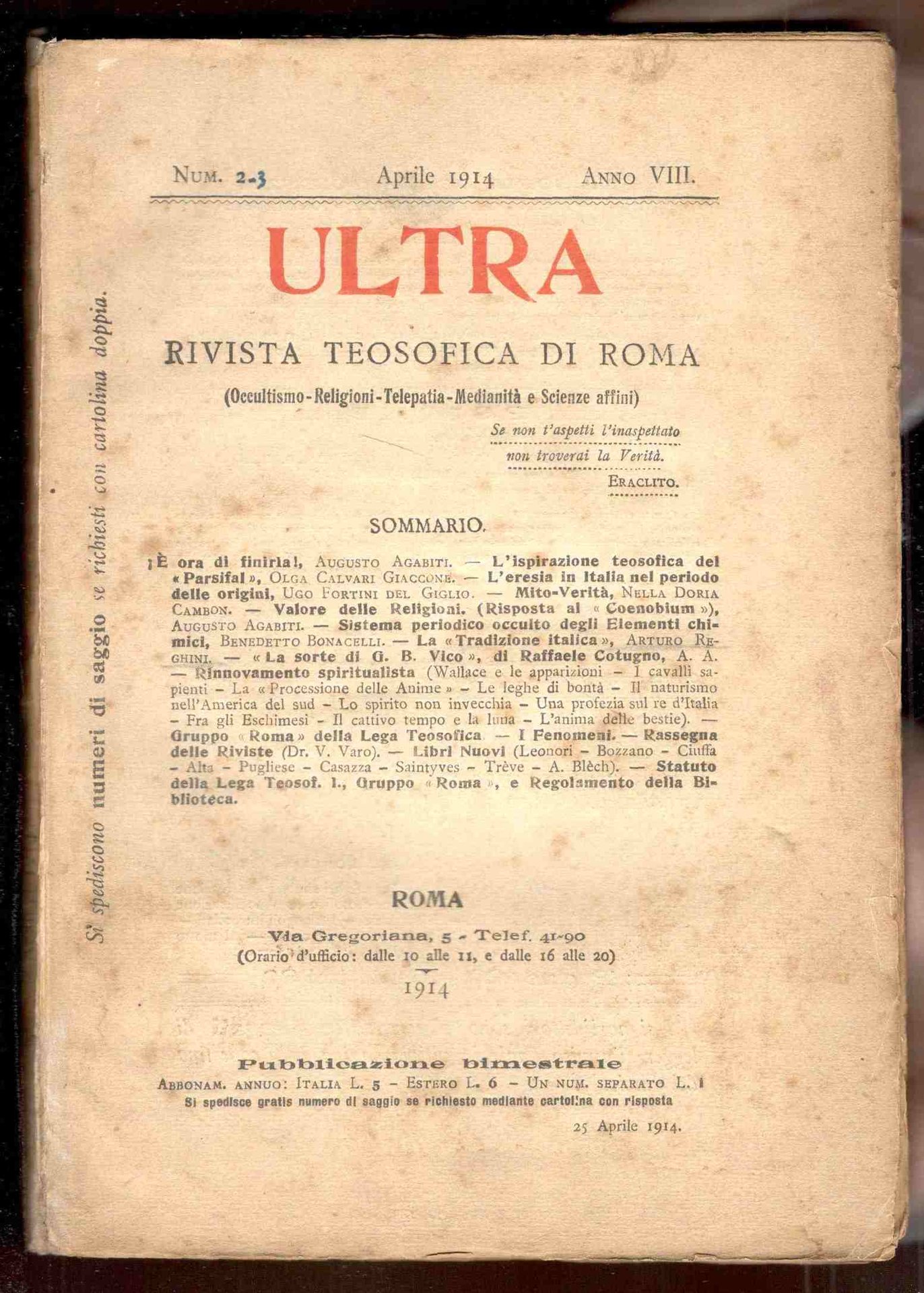 ULTRA. Rivista teosofica di Roma (Occultismo, Religioni, Telepatia, Medianità e Scienze affini). Anno VIII, n. 2-3. Aprile 1914