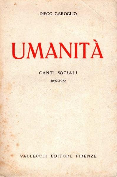 Umanità. Canti sociali 1892-1922, prima edizione 1922, pp. 597, formato 12,5 x 19.<BR>Copertina morbida di colore beige con titoli in nero e rosso al piatto anteriore e in nero sul dorso. Volume intonso. <BR>Fioriture ai piatti e sul dorso. Nel complesso condizioni molto buone.
