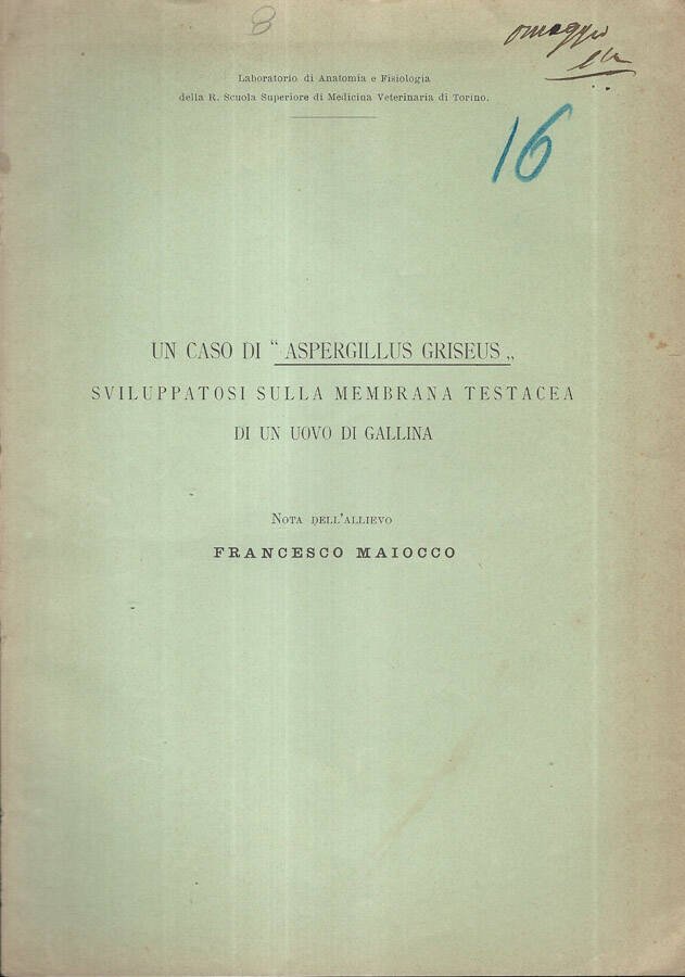 Un caso di "Aspergillus Griseus" sviluppatosi sulla membrana testacea di un uovo di gallina | Libri antichi e moderni | Francesco Maiocco