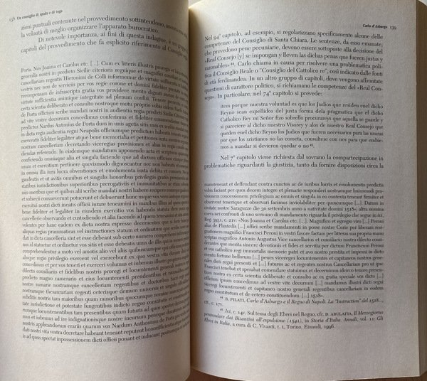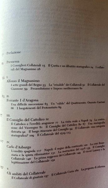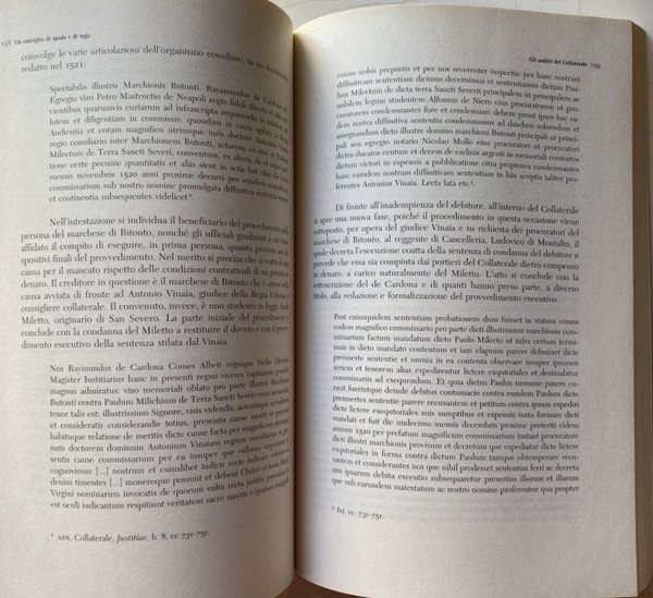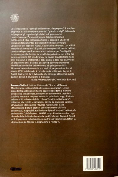 Il libro di Rossana Sicilia si occupa di una delle istituzioni fondamentali di quest'ultimo tipo: il Consiglio Collaterale del Regno di Napoli. L'autrice ha affrontato con abilità lo studio di alcune fonti di particolare complessità per via del loro carattere disperso e frammentario, così come per l'ambiguità terminologica che ha reso incerta l'interpretazione dei fatti e dei loro svolgimenti. Ciò ponderando, ha deciso di addentrarsi negli anni più oscuri e problematici delle origini e delle fasi di avvio di un organismo che, a cavallo dei periodi convenzionalmente identificati con la fine del Medioevo e il principio dell'Età Moderna, determineranno la sua evoluzione posteriore fino al secolo XVIII. In tal modo, è tutta la storia politica del Regno di Napoli tra i secoli XV e XVI quella che si svolge attraverso queste pagine, dense di erudizione e di analisi." (dalla presentazione di C. Hernando Sànchez).