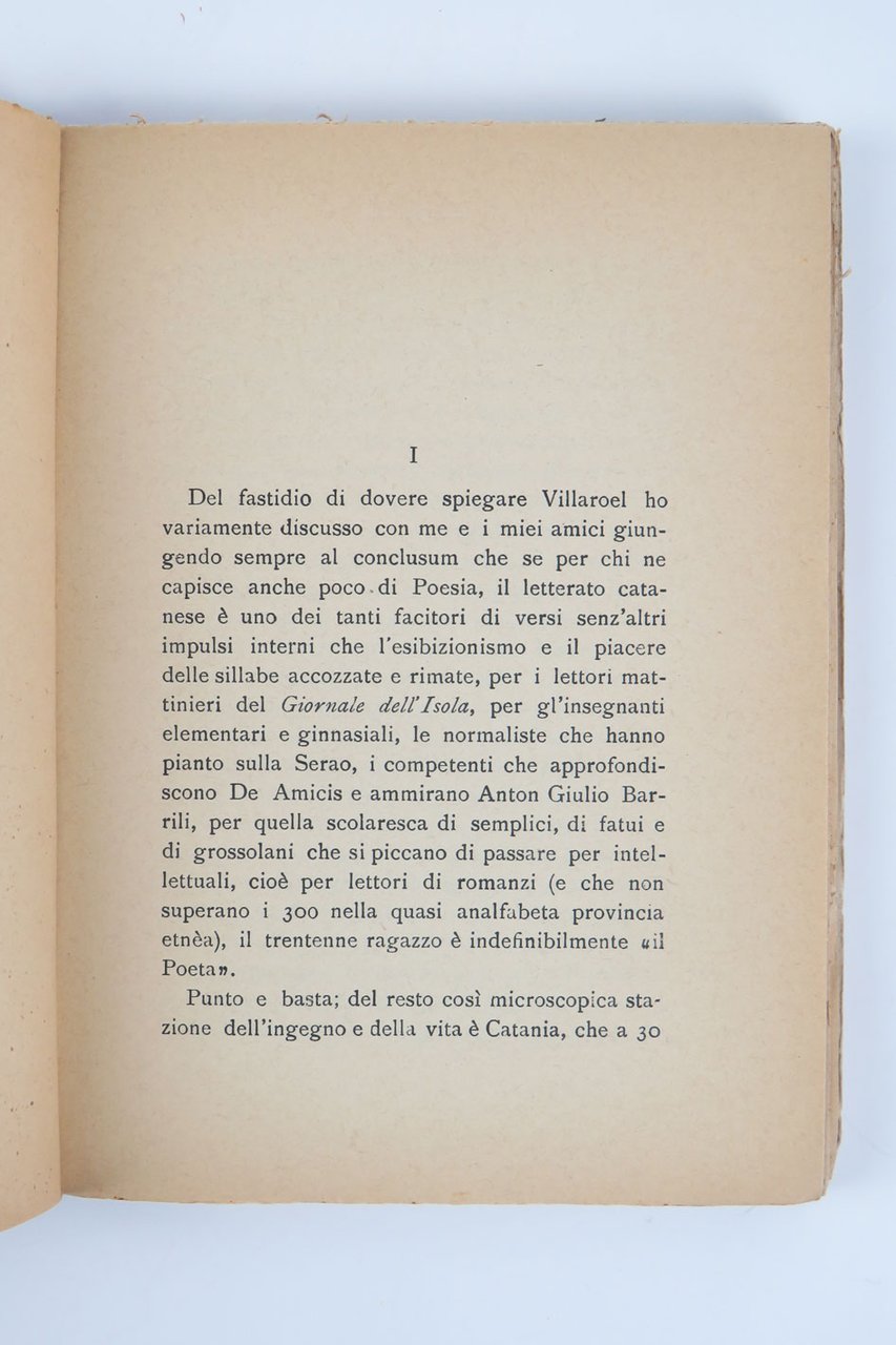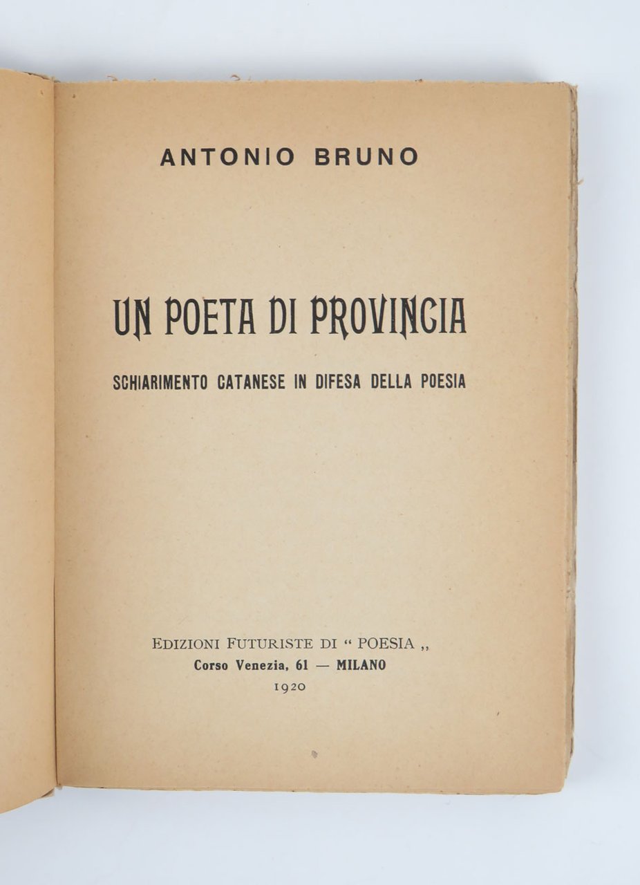 LIBROEdizione originale. Ottimo esemplare.Esordio di Bruno con le edizioni di Filippo Tommaso Marinetti, segna contemporaneamente il suo apice futurista e la sua ultima edizione nel solco dell’ufficialità del movimento. «[P]olemico libello contro la Catania di Villaroel, incompetente, sguaiata, ciarlatana, che consente [a Bruno] di tracciare una lucida sintesi della vita culturale della provincia italiana e siciliana, per sottolinearne il ritardo e l’assoluta dipendenza rispetto alle dinamiche nazionali e internazionali» (Ruta, Il futurismo in Sicilia, p. 137).Cammarota, Futurismo, 61.5