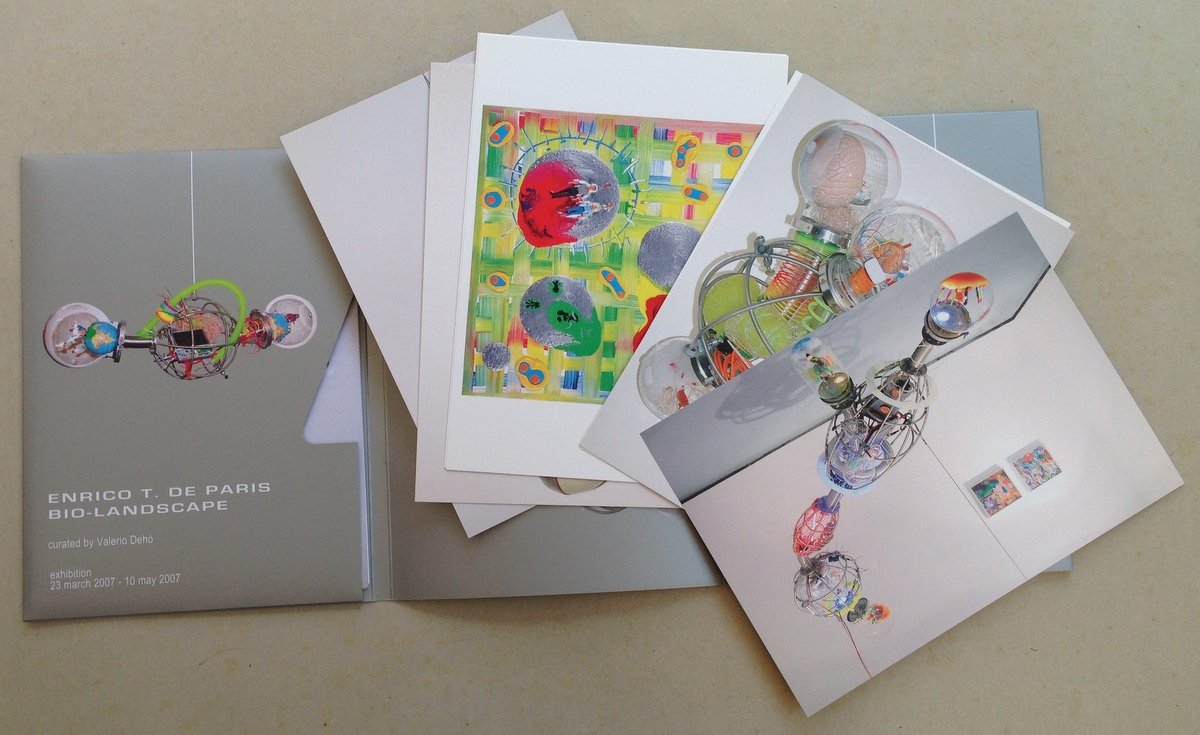V. Dehò (a cura di), Enrico T. De Paris Bio Landscape Byblos Art Gallery, Mostra 23 marzo 2007 - 10 maggio 2007; cm. 22x16; cartellina cartoncino ed. ill. a col. contenente un fascicolo pp. nn (pp. 12) con testo bilingue italiano-inglese e 7 cartoline ill. a col. Condizioni di conservazione Volume in ottimo stato. SETT73.L19680 MT