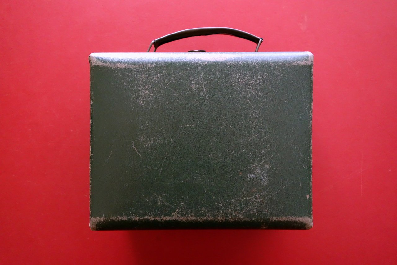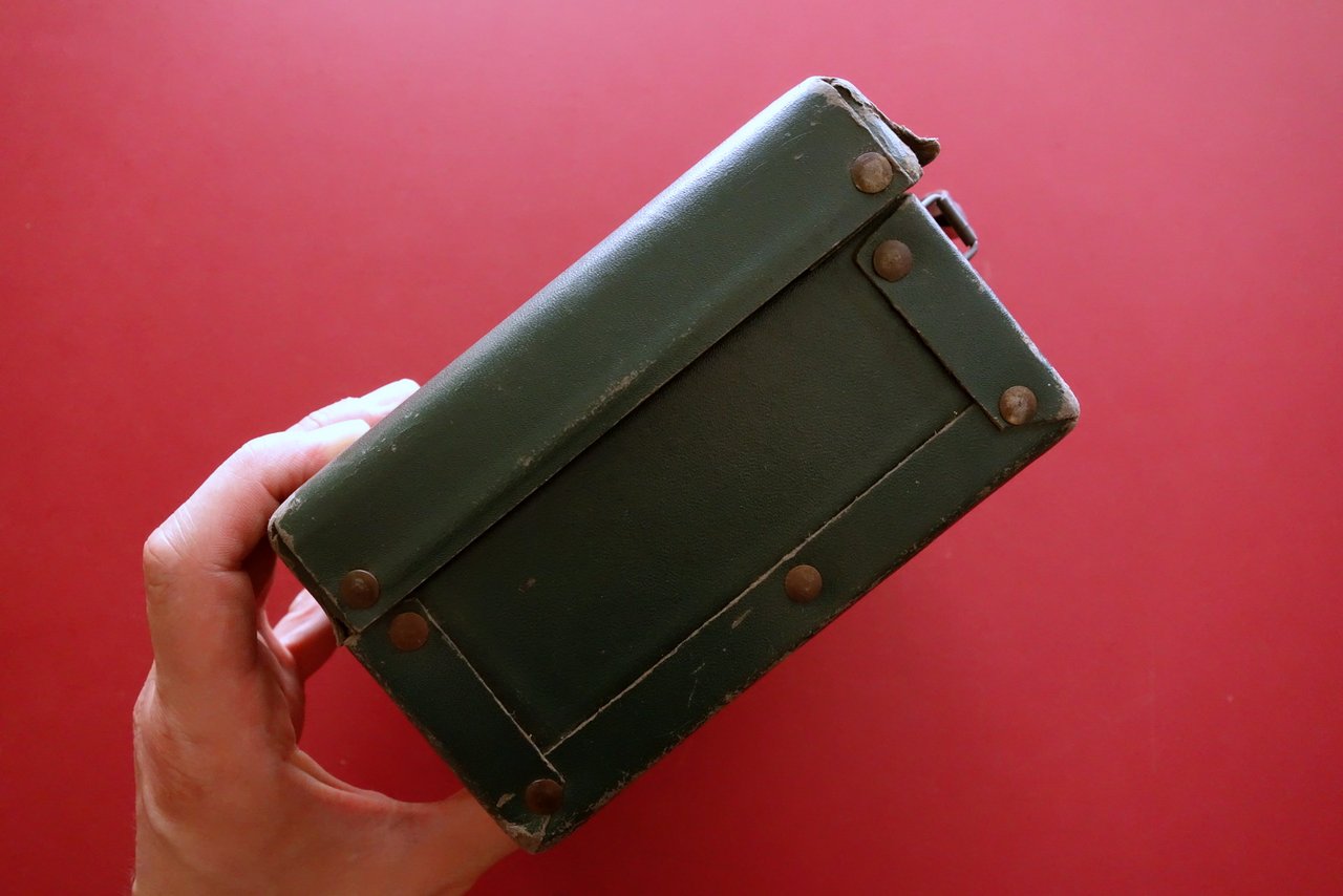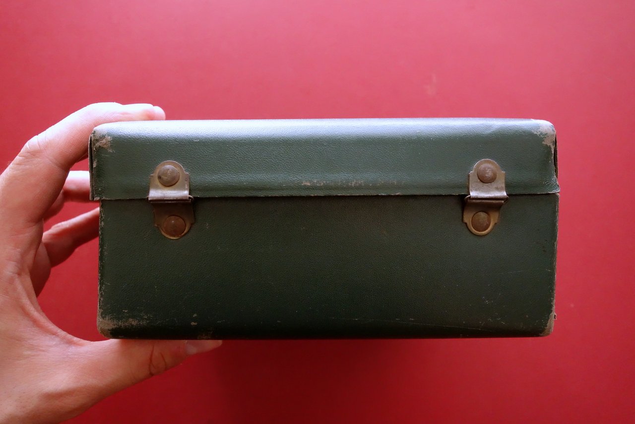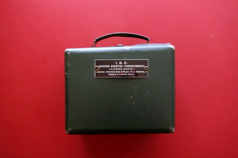 Valigetta, Valigetta I.G.C. Industria Giocattoli Cinematografici 'Cinema Rapid' direzione e amministrazione in Milano - Piazza Argentina 3; fabbrica in Lanciano (Chieti)" anni '30 del Novecento Milano - Lanciano, s. d. ma anni '30 del Novecento; valigetta in cartone rigido verde scuro con targhetta applicata al lato frontale mediante due chiodini metallici; maniglia e chiusura originali in metallo. Dimensioni cm 19x14,5x9. Condizioni di conservazione Complessivamente in buone condizioni con tracce d'uso e leggeri segni del tempo, alcuni graffietti e per lo pi√π marginali abrasioni, alcune minuscole macchiette di colore bianco, un angolo del coperchio con piccola rottura ma esemplare compatto. Per ulteriori dettagli vedi foto. SC05.L0107 N "