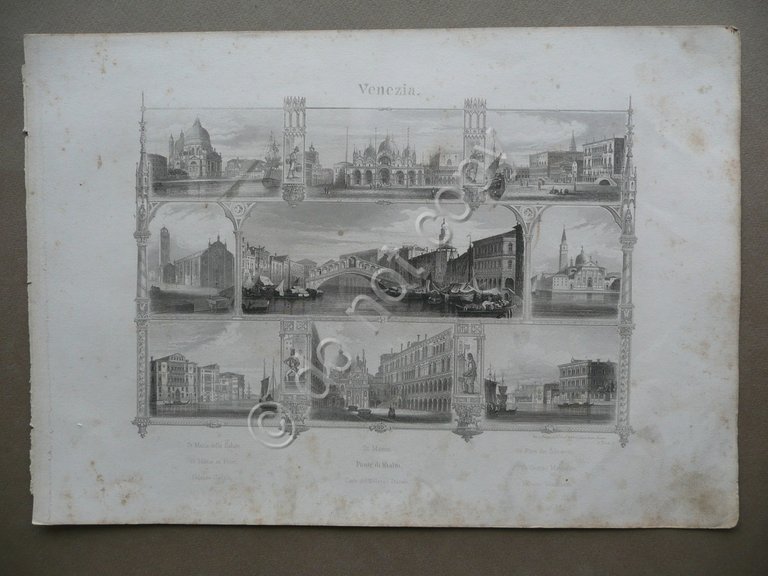 Vedute multiple, Venezia Ponte di Rialto Vedute multiple A. Fesca Sc., Stab. Artistico del Lloyd Austriaco, Trieste, s.d. (metà Ottocento circa), serie di vedute incise in b/n su carta, cm 23x33,5. Condizioni di conservazione Esemplare in buone condizioni con tracce d'uso, leggere bruniture e alcune lievi tracce di sporco, due angoli leggermente arrotondati e con minimi difetti, una margine con tracce di precedente inserimento entro volume.