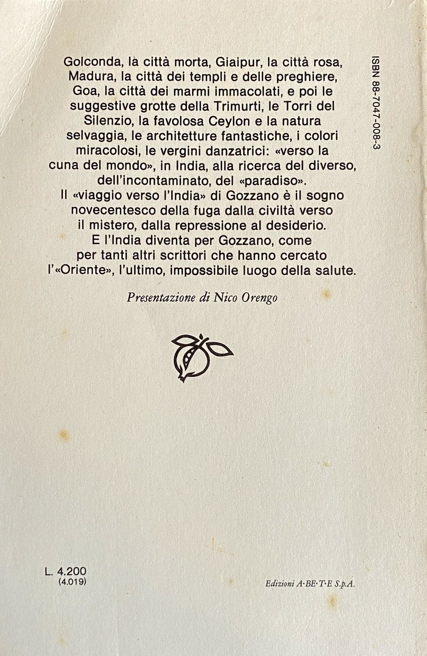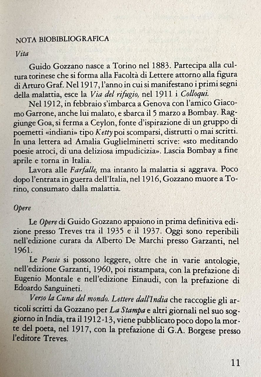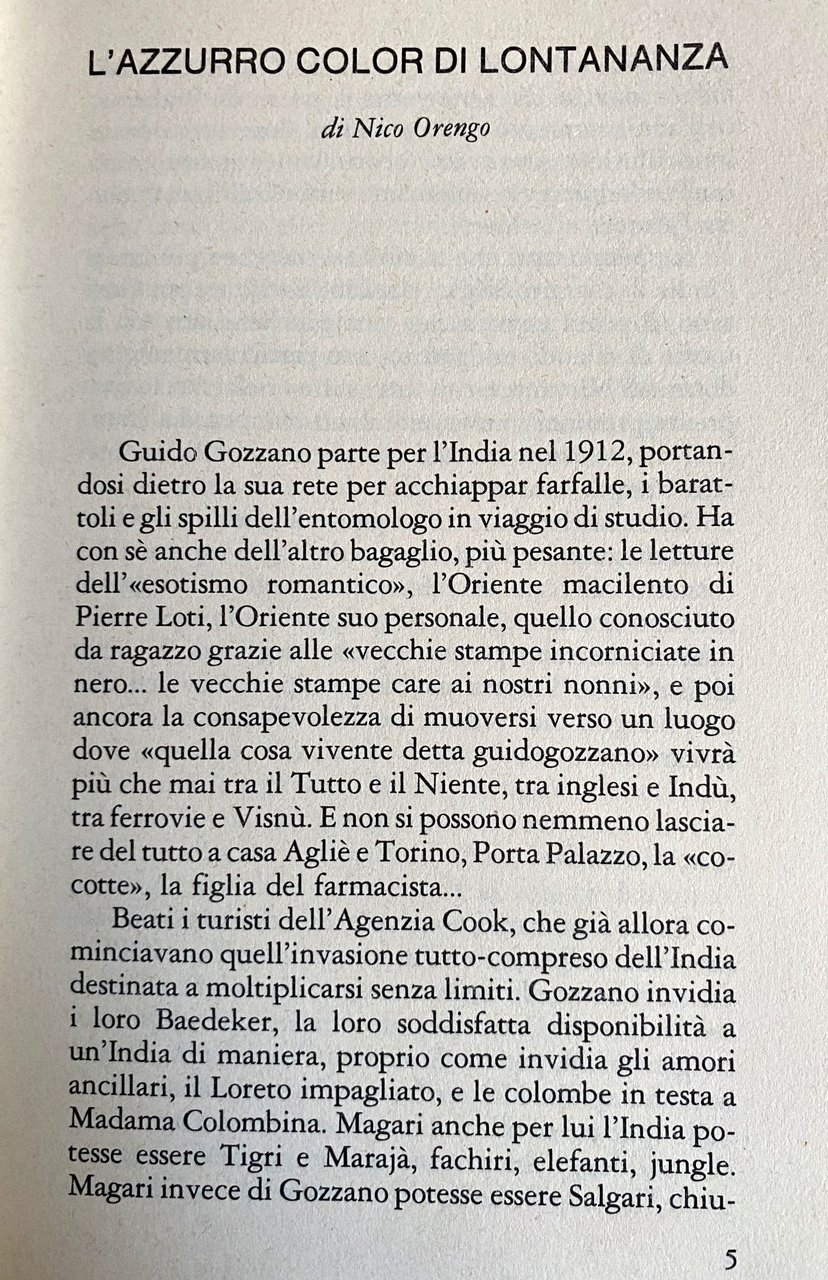 Tra il febbraio e l'aprile del 1912 Gozzano compie un viaggio in India, che lo porterà a visitare la città di Bombay e l'isola di Ceylon. Un itinerario modesto, ma un'esperienza centrale nella non lunga vita dello scrittore piemontese. La decisione di partire è dettata innanzitutto da motivi terapeutici (guarire dalla tubercolosi), ma il pellegrinaggio di Gozzano alla culla del mondo diventa un fatto cruciale su cui si catalizzano le sue rappresentazioni sull'Oriente, prima, in prospettiva e in attesa, e poi, con il ricordo e la trasfigurazione letteraria. II viaggio in India finisce così con il riverberarsi su tutta la produzione gozzaniana. Golconda, la città morta, Giaipur, la città rosa, Madura, la città dei templi e delle preghiere, Goa, la città dei marmi immacolati, e poi le suggestive grotte della Trimurti, le Torri del Silenzio, la favolosa Ceylon e la natura selvaggia, le architetture fantastiche, i colori miracolosi, le vergini danzatrici: verso la cuna del mondo, in India, alla ricerca del diverso, dell'incontaminato, del paradiso. II viaggio verso l'India di Gozzano è il sogno novecentesco della fuga dalla civiltà verso il mistero, dalla repressione al desiderio. E l'India diventa per Gozzano, come per tanti altri scrittori che hanno cercato l'Oriente, l'ultimo, impossibile luogo della salute.