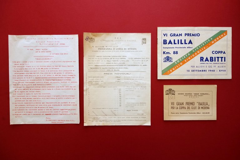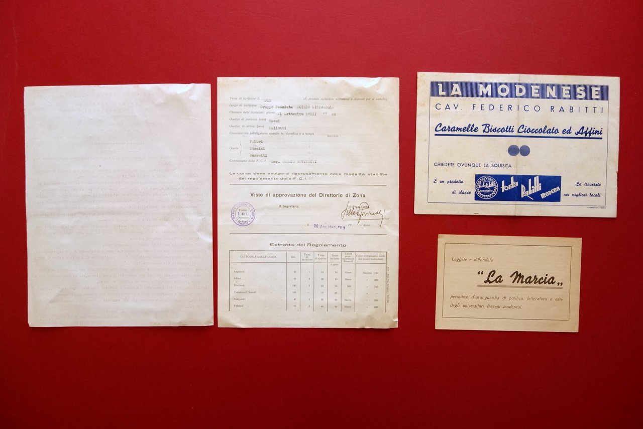 Fascicolo di presentazione e due moduli, Società Ciclistica D. Sinigaglia" - Modena VI° Gran Premio Balilla Campionato provinciale allievi Km 88 Coppa Rabitti per Allievi e GG. FF. Allievi 15 settembre 1940 G. Ferraguti e C. - Modena 1940; cm 17x24,5; pp. 8 non num., con una bellissima pubblicità Ferrari alla prima pagina (vedi foto); brossura ed. con grafica a colori. Accluse due lettere dattiloscritte relative alla suddetta competizione (regolamento e premi individuali), più una brossura di presentazione del VII° Gran Premio Balilla del 1942 (vedi foto). Condizioni di conservazione Fascicolo ben conservato con leggere tracce d'uso, piega longitudinale di conservazione, brossure con qualche leggera brunitura. Interni buoni. Lettere dattiloscritte ben conservate con tracce d'uso, lievi stropicciature ai margini e poche minime bruniture. Accluse due lettere dattiloscritte relative alla suddetta competizione (regolamento e premi individuali), più una brossura di presentazione del VII° Gran Premio Balilla del 1942 (vedi foto). Alla prima pagina del fascicolo di presentazione una bellissima nonché pubblicità della giovane azienda Ferrari (vedi foto). SC03.D16348 N "