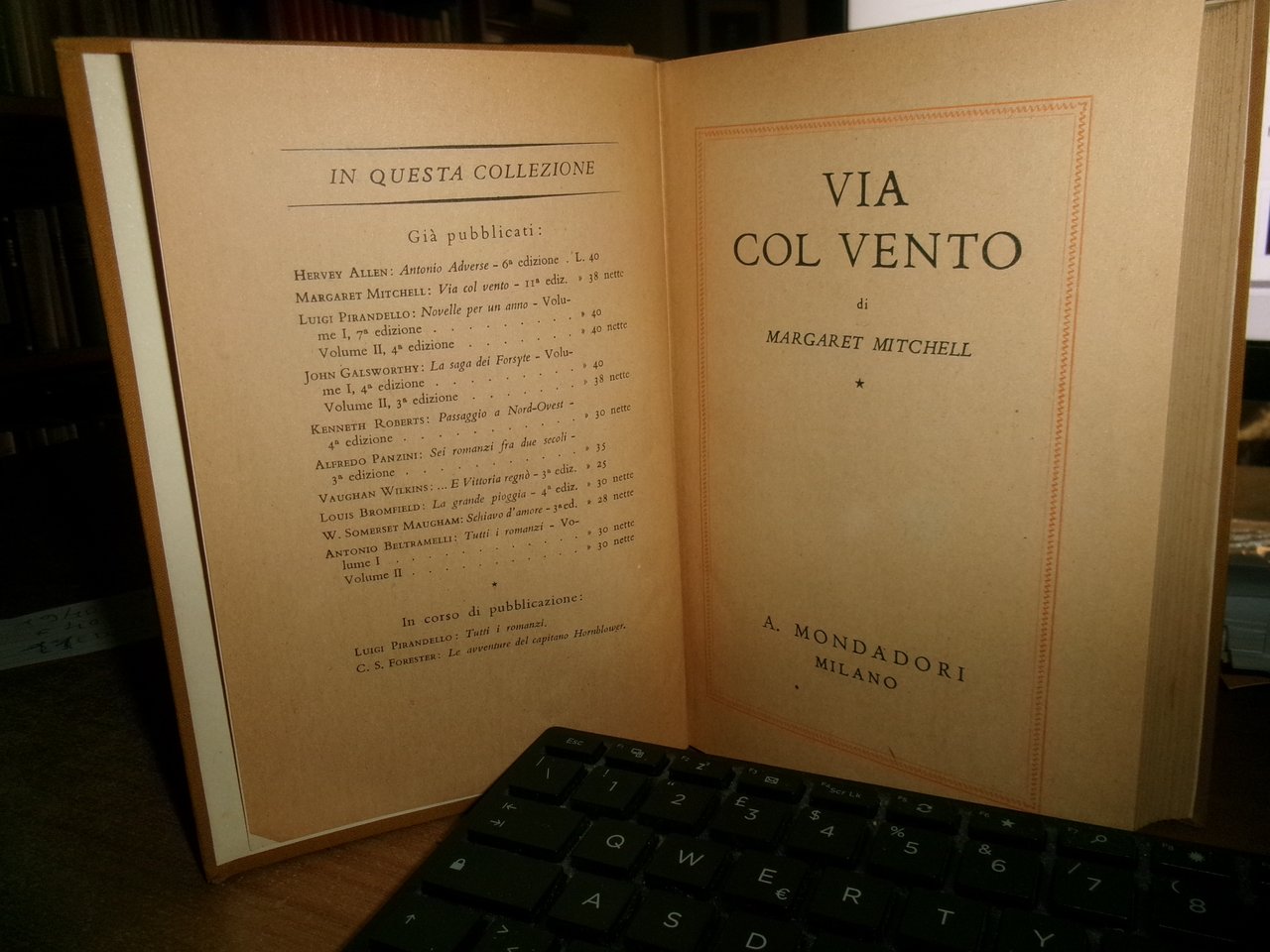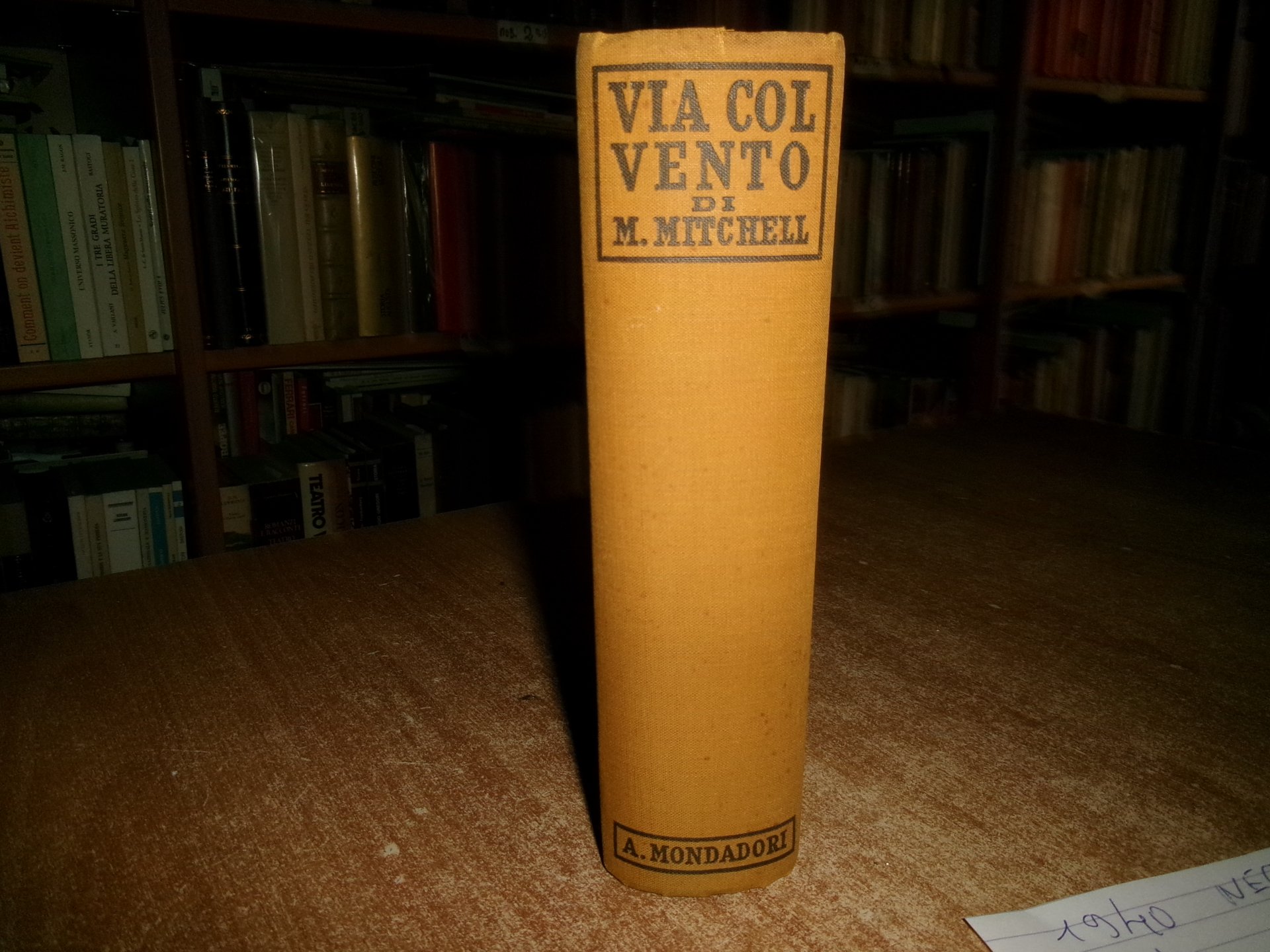 VIA COL VENTO di MARGARET MITCHELL. Milano, A. Mondadori, 1940. In-8° piccolo, tela edit. con il titolo al dorso. 1039 pp. Ben conservato. Neg. mob. 12 erot.
