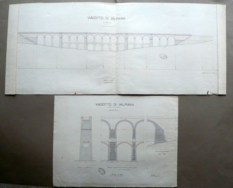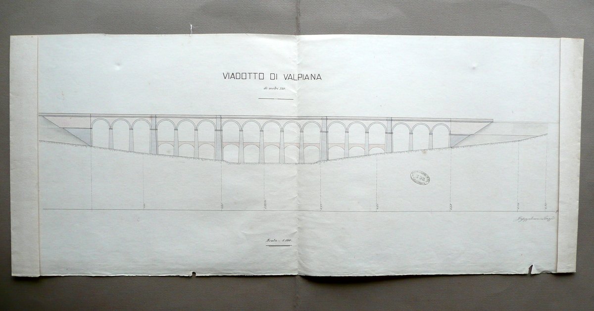 Progetto (due tavole), Viadotto di Valpiana di metri 250 scala 1.500 *** Viadotto di Valpiana - Particolari scala 1.200 S. d. (1892 circa); due belle tavole relative a progetto architettonico, realizzate a mano, con dettagli a colori; entrambe le tavole con vecchio timbretto, e firmate Giuseppe Coppi (vedi foto). Cm 33,5x80,5; cm 33x45. Condizioni di conservazione Esemplare ben conservato con tracce d'uso e alcune piccole piccole leggerissme bruniture; margine inf. della tavola di maggiori dimensioni con due piccoli strappetti. Entrambe firmate dall'Ingegnere progettista Giuseppe Coppi. SC03.D13228 F N