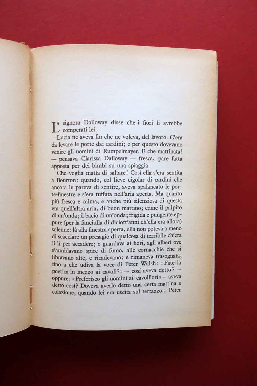 Virginia Woolf, La Signora Dalloway con otto illustrazioni di Luigi Broggini Mondadori, Milano 1949; cm 21x14; pp. 288 con 8 ill. a colori fuori t.; tutta tela ed. con sovraccoperta ed. ill. a colori. Condizioni di conservazione Buone condizioni con tracce d'uso; sovraccoperta ed. con alcune minime / minuscole marginali mancanze e strappetti, pressoché trascurabili tracce di sporco. Volume e interni in buone condizioni, con minimi accenni di ingiallimento ai margini delle pagine. Rara seconda edizione (luglio 1949). SETT95.L25731 N