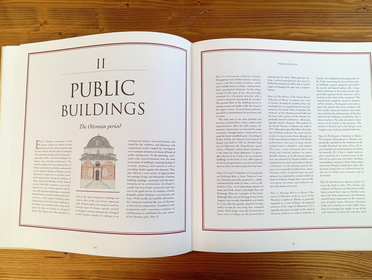 Volume rilegato in tela con immagine applicata al piatto e titolo impresso al dorso, custodia editoriale originale, 147 pagine splendidamente illustrate con disegni a colori. Testo in lingua inglese - English text. Tenue ingiallimento ai margini della custodia, peraltro copia eccellente, come nuova / Very light yellowing to the slipcase margins, otherwise as new -- Opera di fondamentale importanza per lo studio dell'architettura di Smirne e dell'Anatolia occidentale / Fundamental work on the architecture of Izmir and Western Anatolia